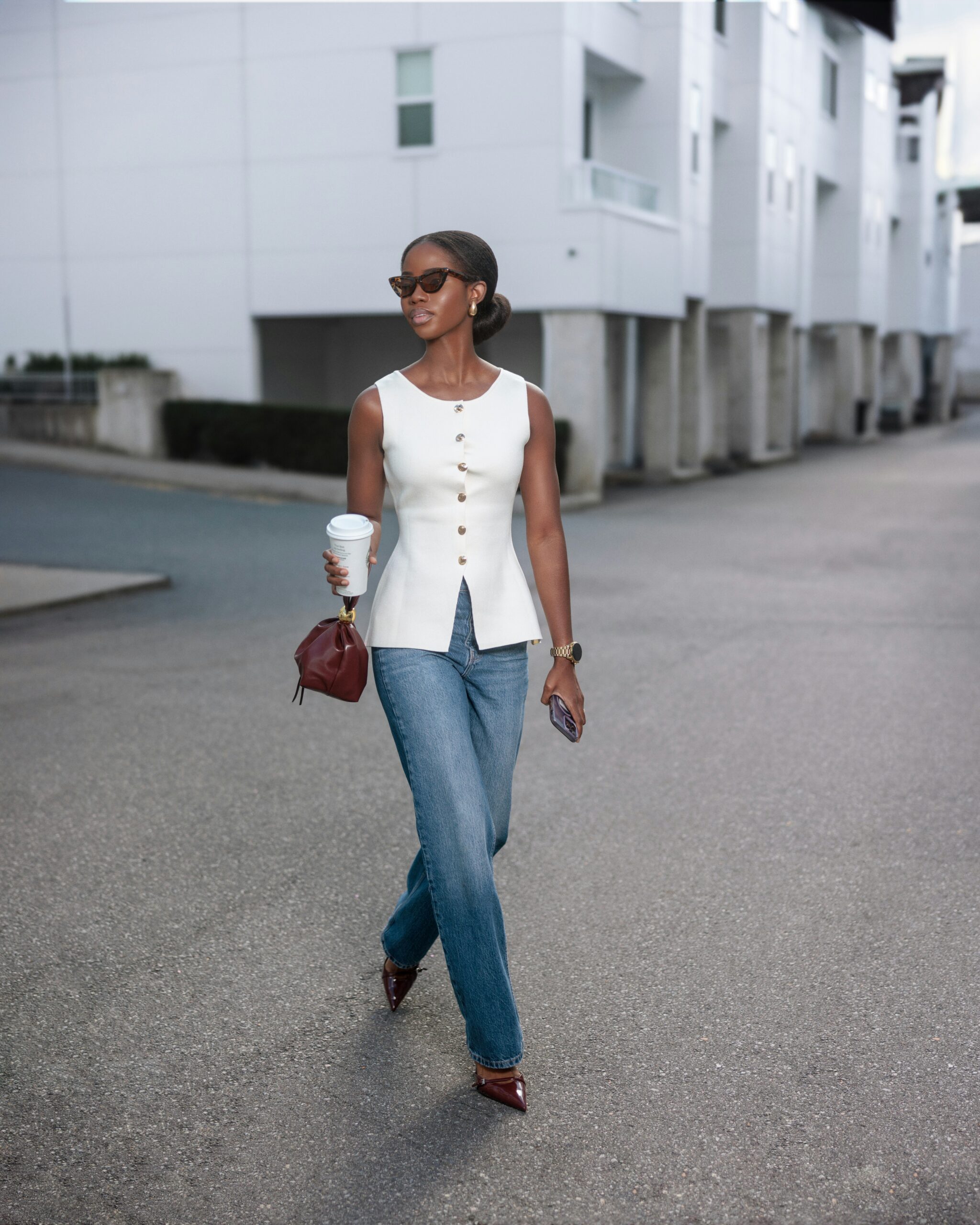 White tops paired with dark denim strike the perfect balance between crisp polish and casual ease. The contrast highlights the brightness of the top, creating a clean focal point while keeping the overall outfit grounded and versatile.