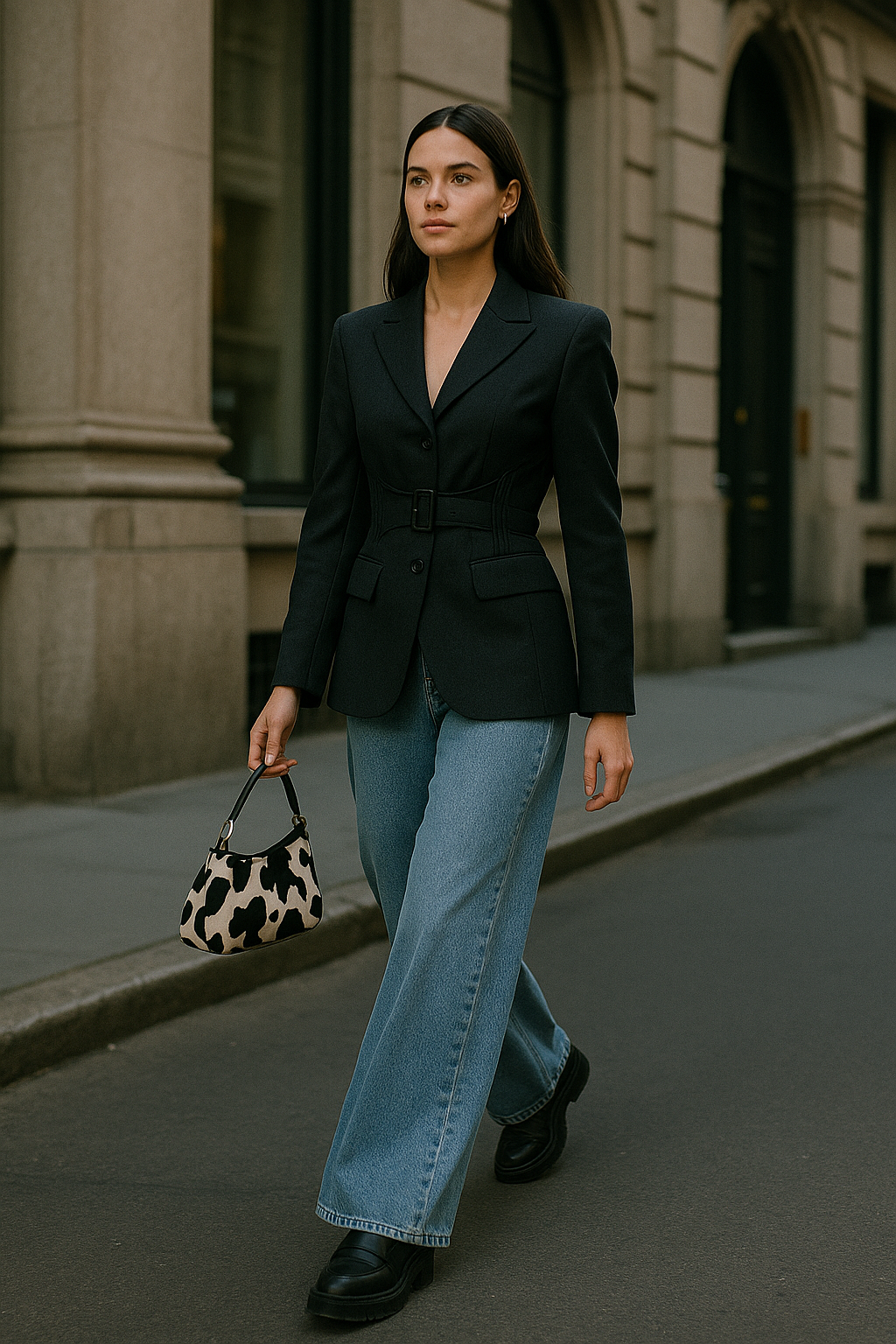 This styling trick works across seasons, adding structure and movement that allows your wide-leg jeans to flow effortlessly and create subtle drama with every step.