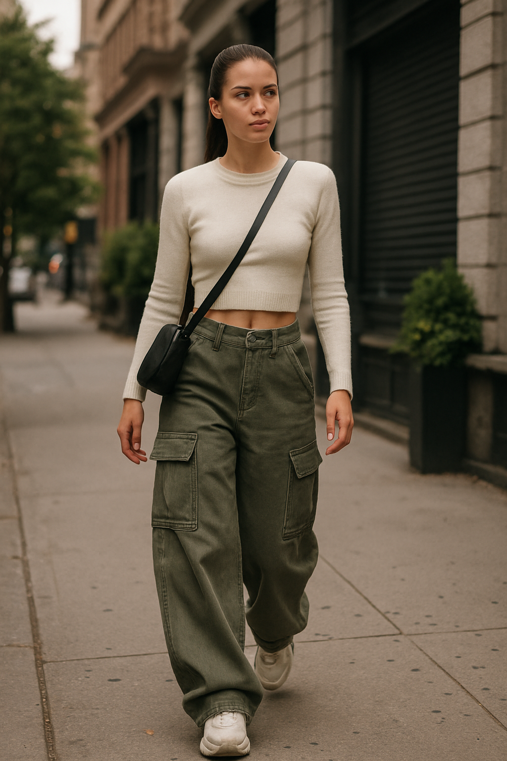 Cargo jeans instantly deliver streetwear credibility thanks to their oversized pockets and slouchy, relaxed silhouette, especially when paired with a cropped sweater or fitted tank that highlights your waistline.