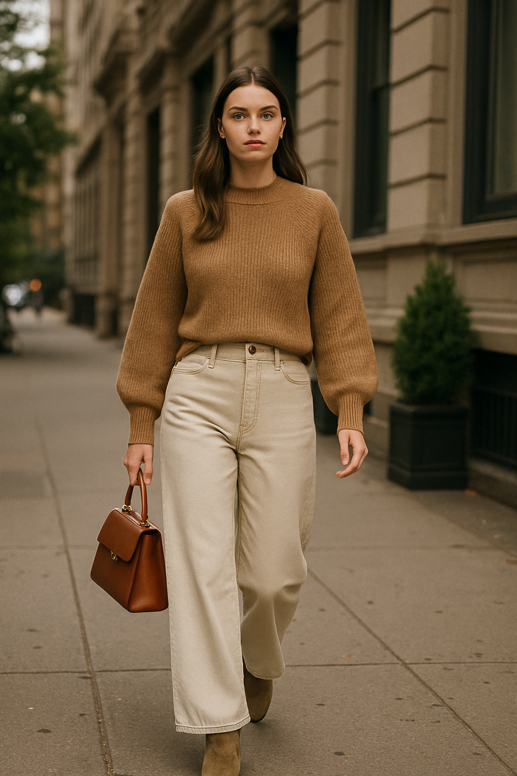 Soft textural sweaters with oversized sleeves or chunky ribbed knits create the ultimate cozy-chic pairing with neutral wide-leg jeans, offering an effortlessly put-together look that never feels overworked.