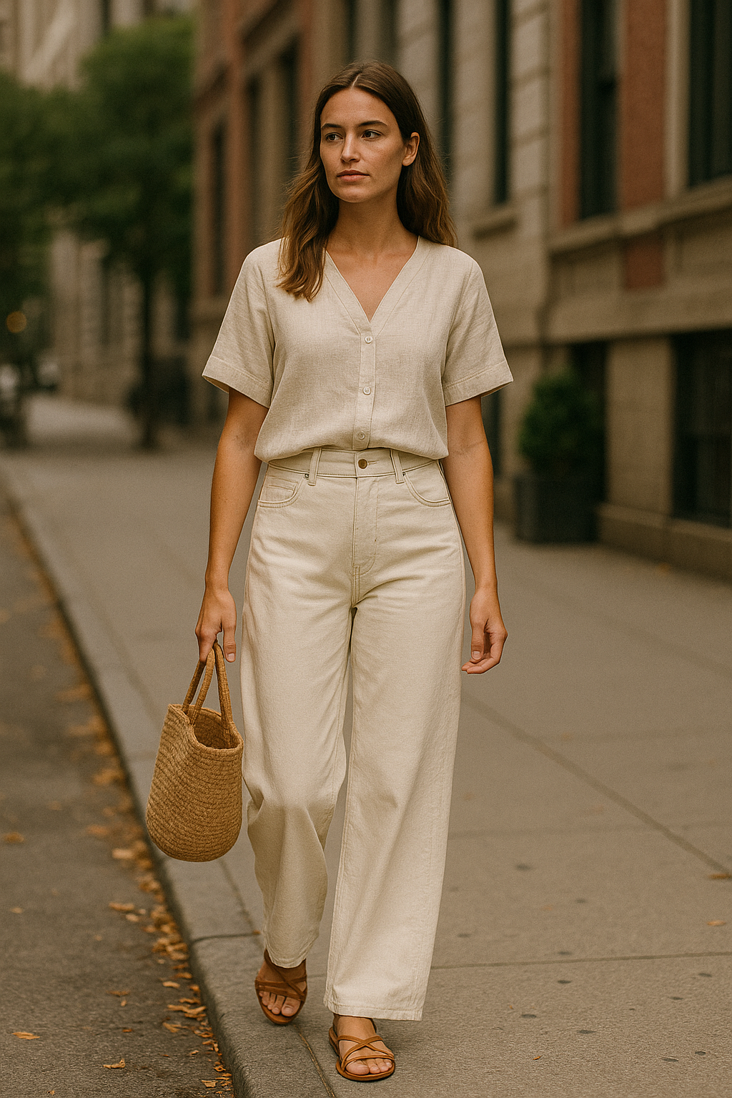 Linen-blend wide-leg jeans are ideal for warm weather because they offer breathability, fluid movement, and a level of comfort regular denim can’t match, especially when paired with a tucked-in lightweight linen top that defines your waist.