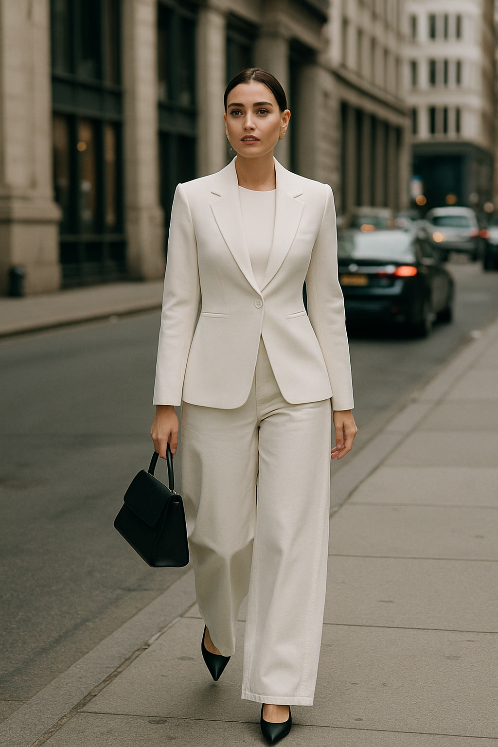 The monochrome technique also creates a streamlined silhouette that feels modern, minimalist, and undeniably chic for any professional or social occasion.