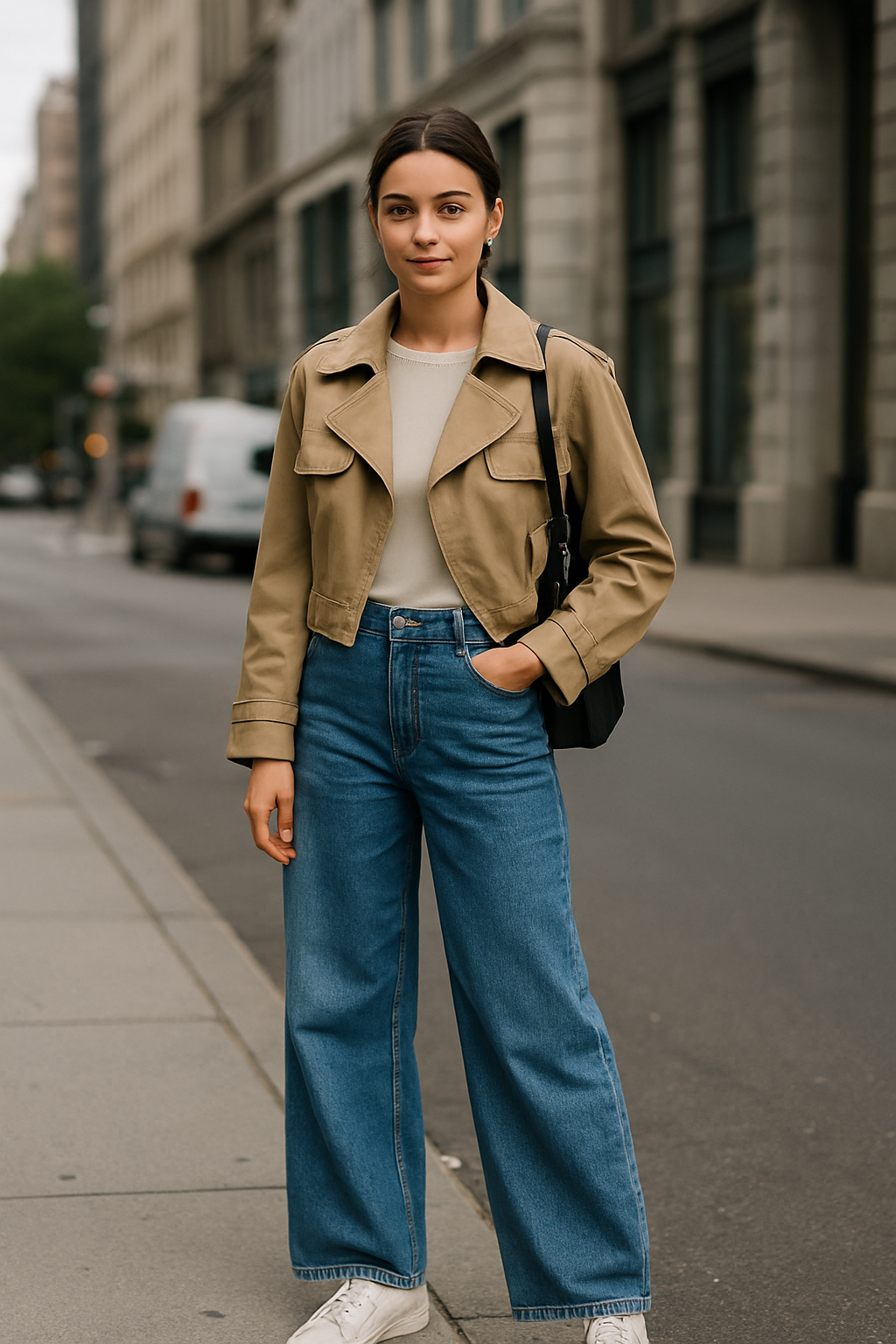 A cropped trench, denim jacket, or bomber creates a flattering split-proportion look with wide-leg jeans, offering the kind of balanced silhouette fashion editors love.