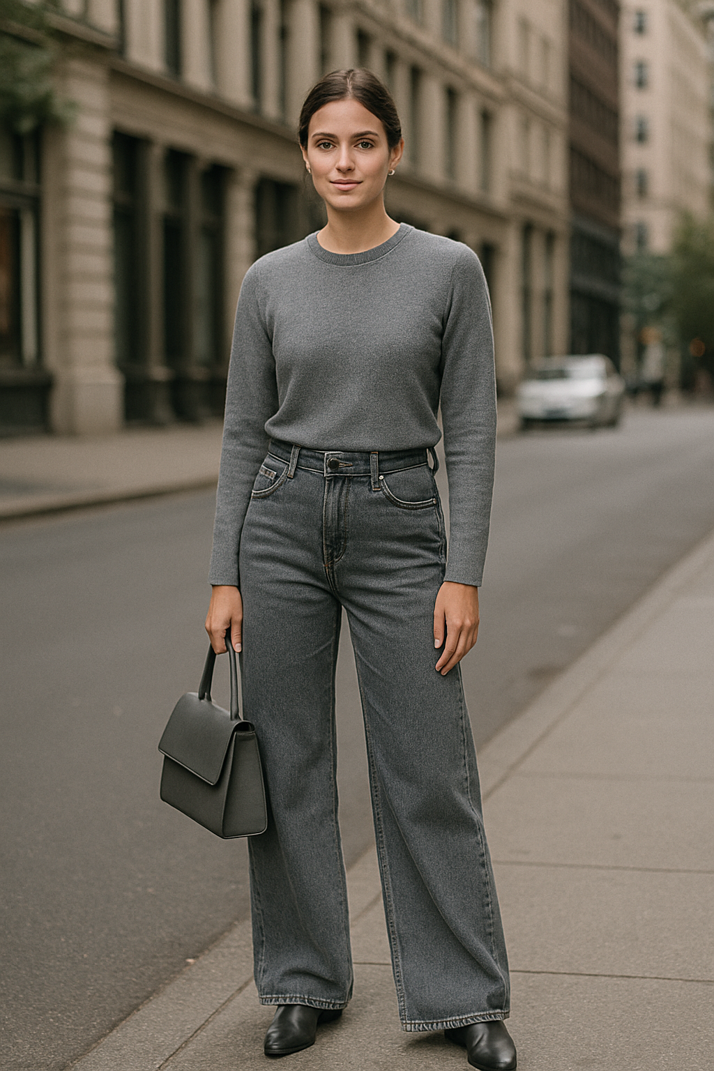 A head-to-toe monochrome outfit with wide-leg jeans creates an intentional, elevated look that feels effortlessly sophisticated, especially when paired with tailored tops or jackets in a single palette like sleek black, soft cream, or warm camel.