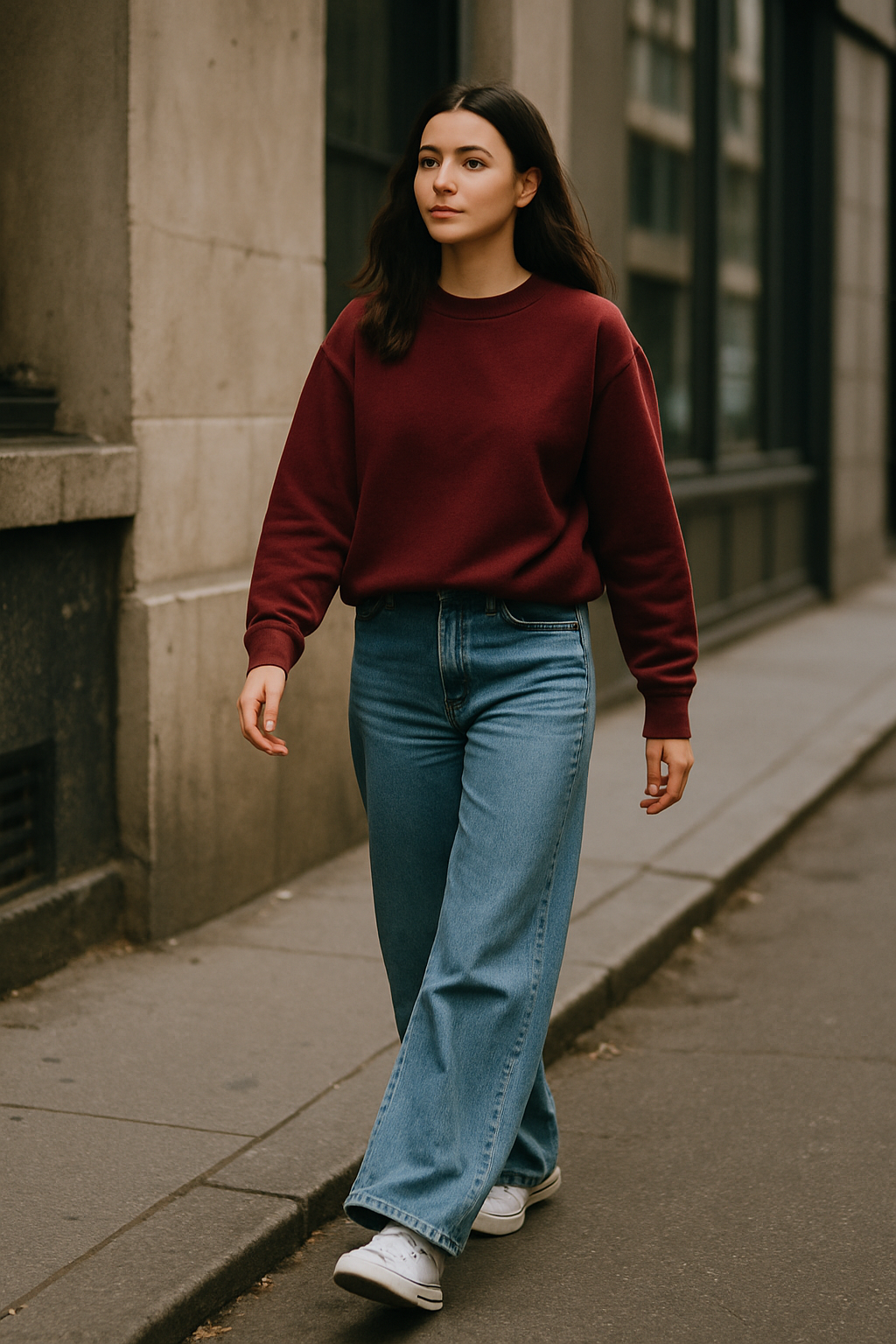 For an easy everyday outfit that requires zero effort, pair wide-leg jeans with classic sneakers and a relaxed tee or sweatshirt for a look that feels natural and unfussy.