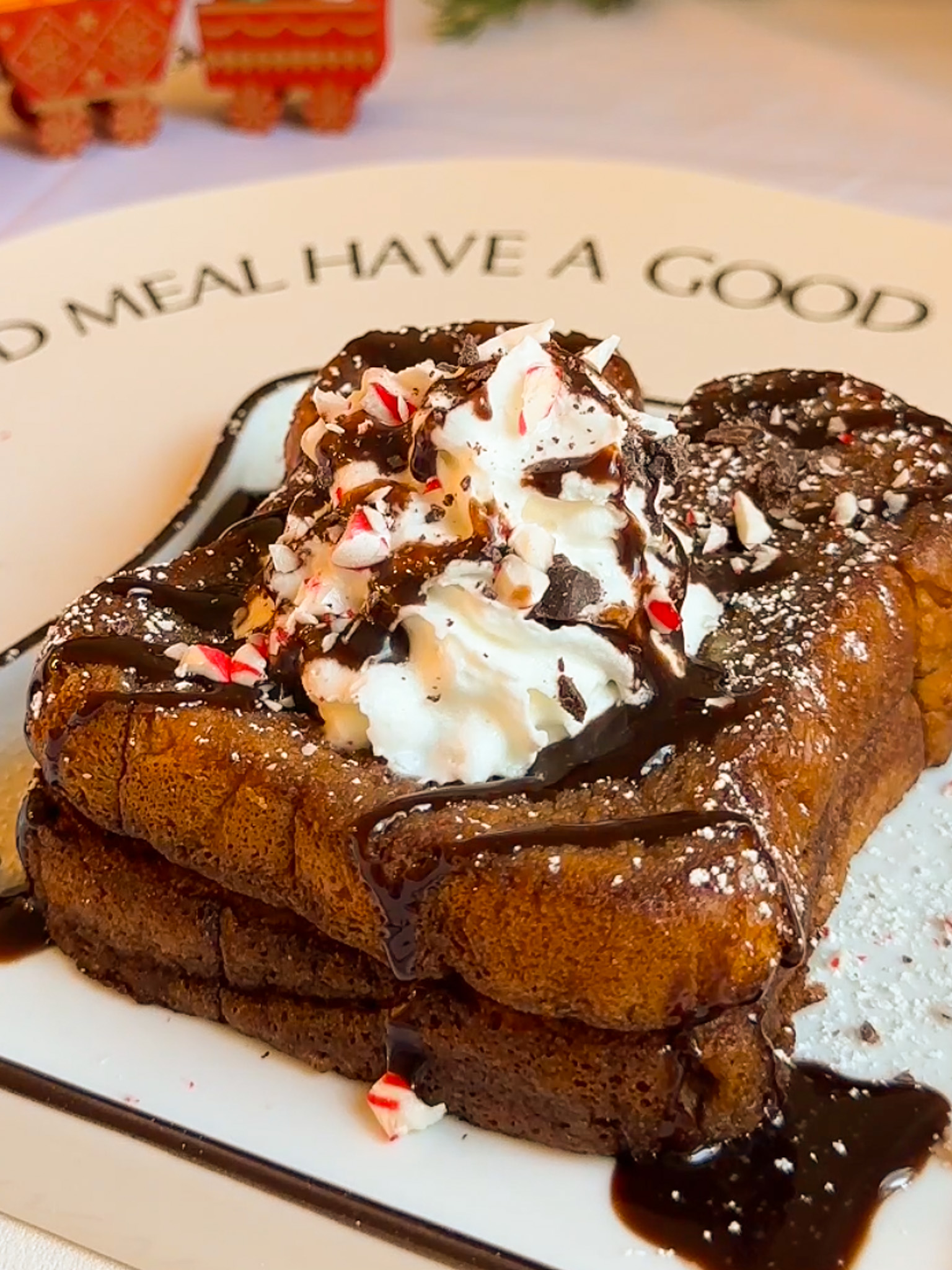 Dip thick slices of bread into an egg mixture flavored with cocoa powder and a hint of peppermint extract.