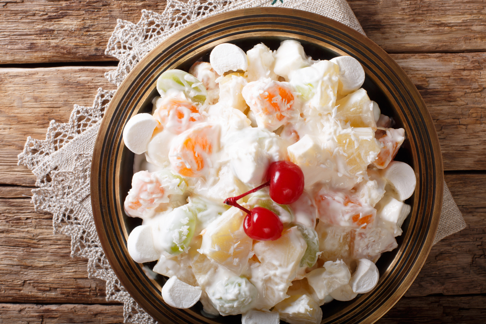 Named after the food of Greek gods, this fruity concoction became a potluck staple throughout the 1960s and 70s. Mandarin oranges, pineapple chunks, coconut flakes, and mini marshmallows mingle in a cloud of whipped cream or sour cream. Some families add maraschino cherries or chopped pecans for extra color and crunch.