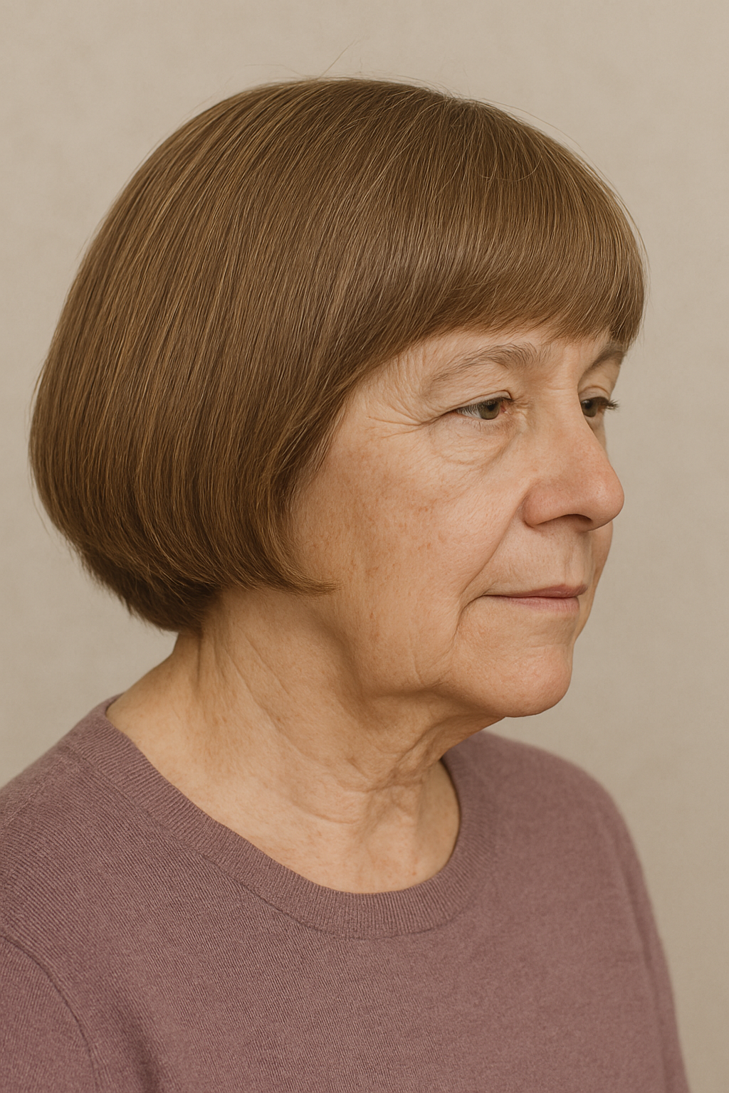 Straight-across bangs paired with rounded edges might remind you of childhood haircuts—and that’s exactly the problem. This style can look costume-like rather than sophisticated, especially with mature features that need more softening.