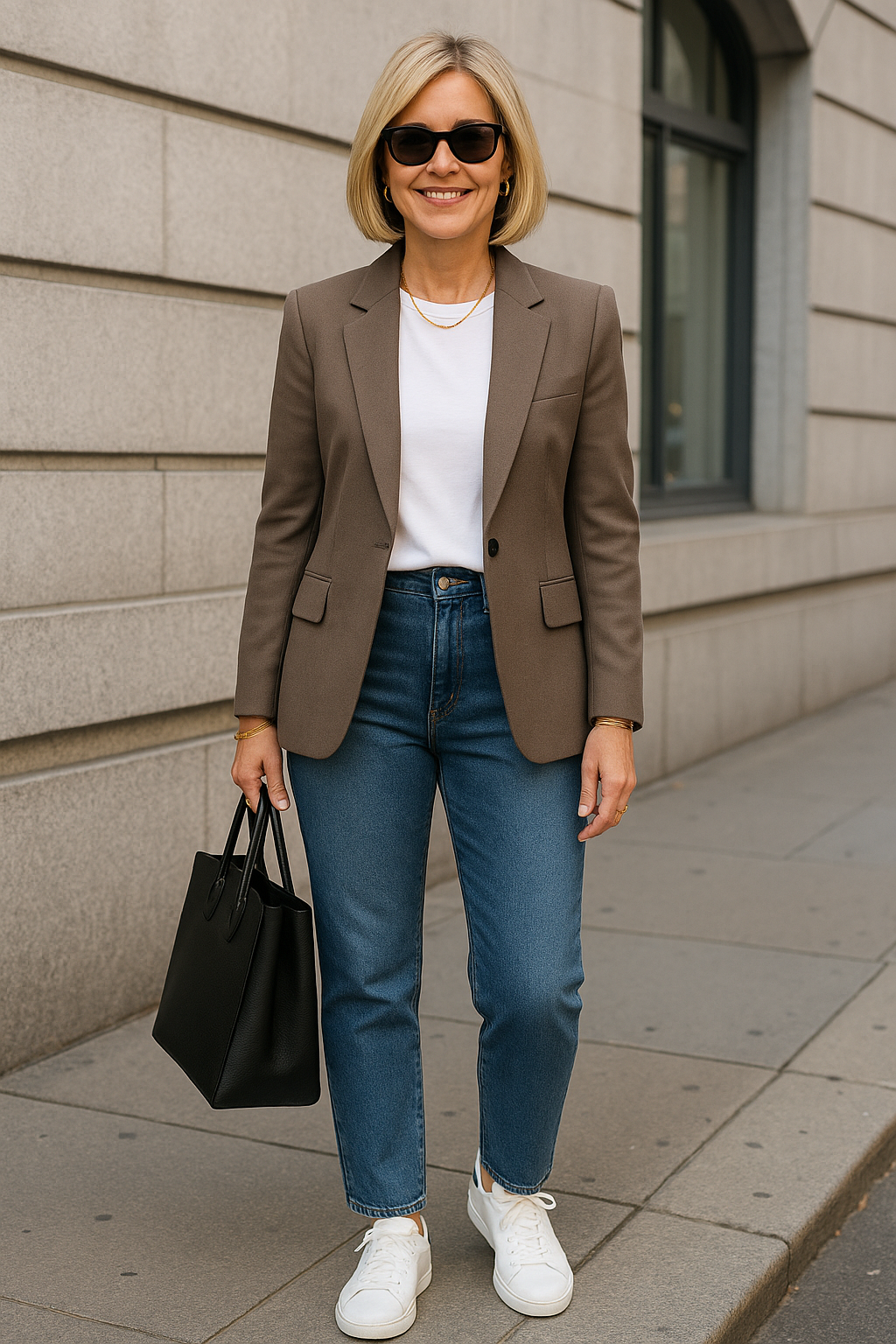 A tailored blazer transforms even the most casual denim-and-tee combo into something runway-ready. The secret lies in the fit—structured shoulders and a nipped waist create that effortlessly polished vibe. When you add crisp white sneakers, the whole look balances sophistication with comfort.
