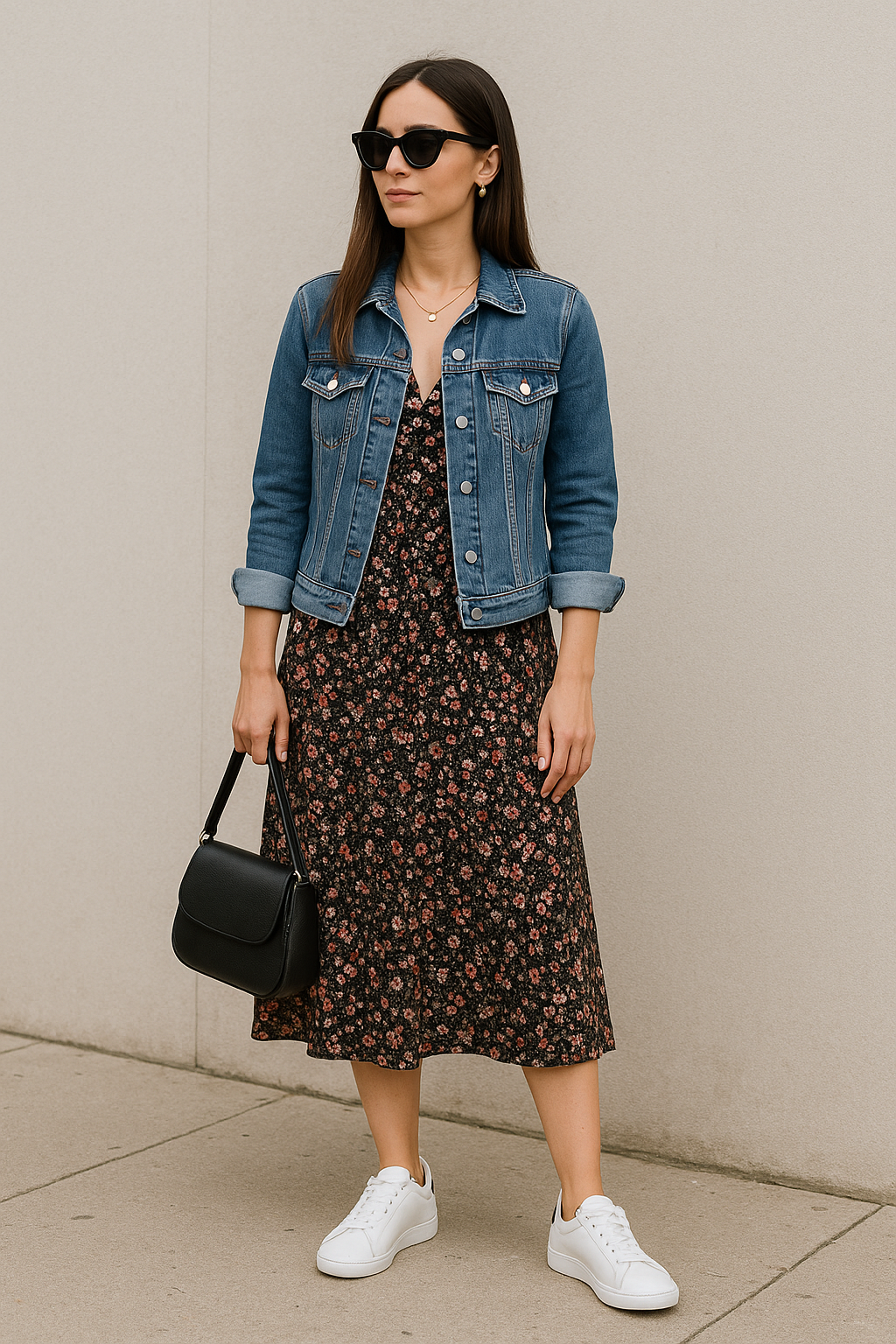 Floral prints and flowing fabrics bring instant femininity to any wardrobe, but pairing them with crisp white sneakers keeps things grounded and approachable. The midi length is universally flattering, hitting at just the right spot to elongate your legs without being too formal. A denim jacket adds texture and contrast, bridging the gap between dressy and laid-back.