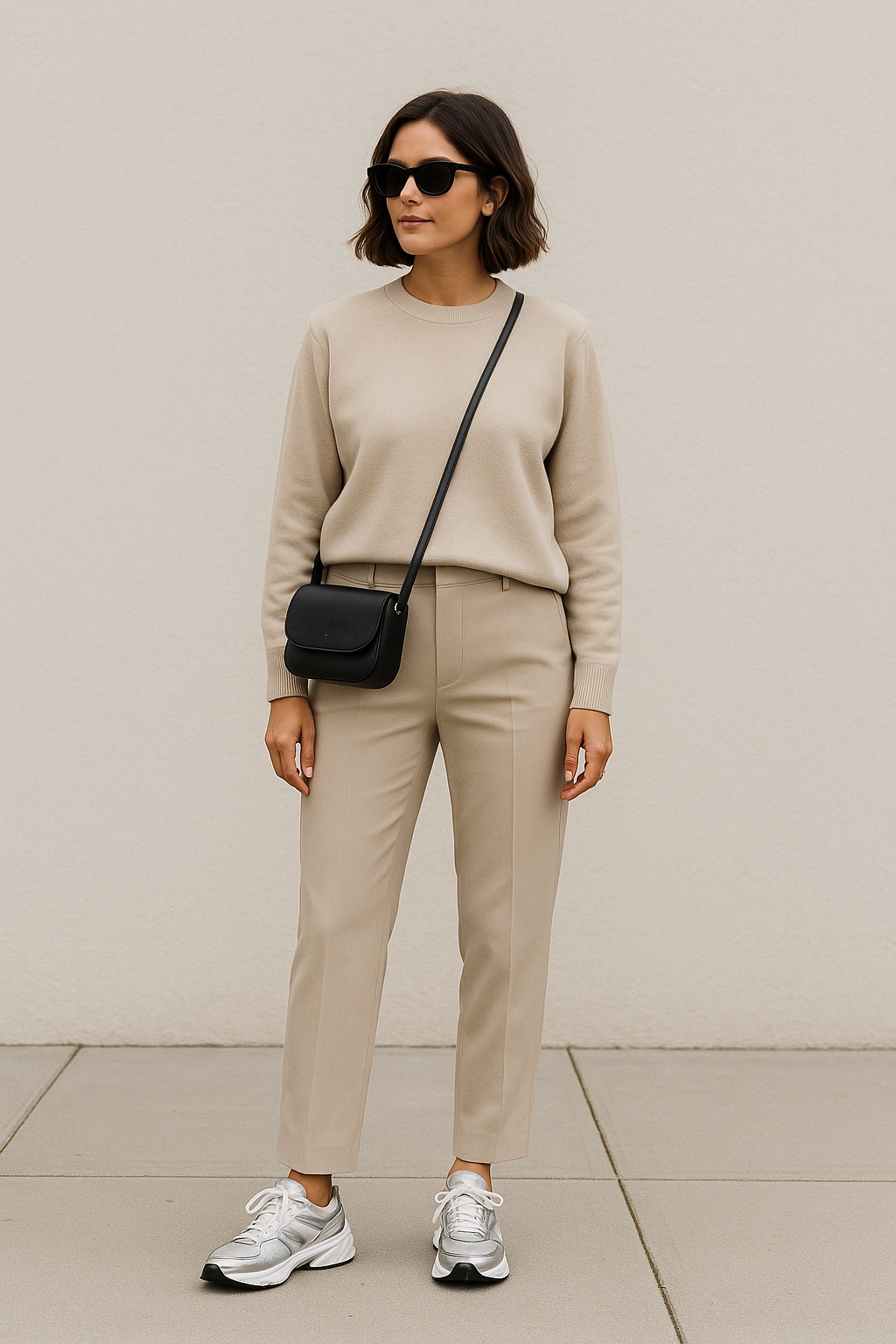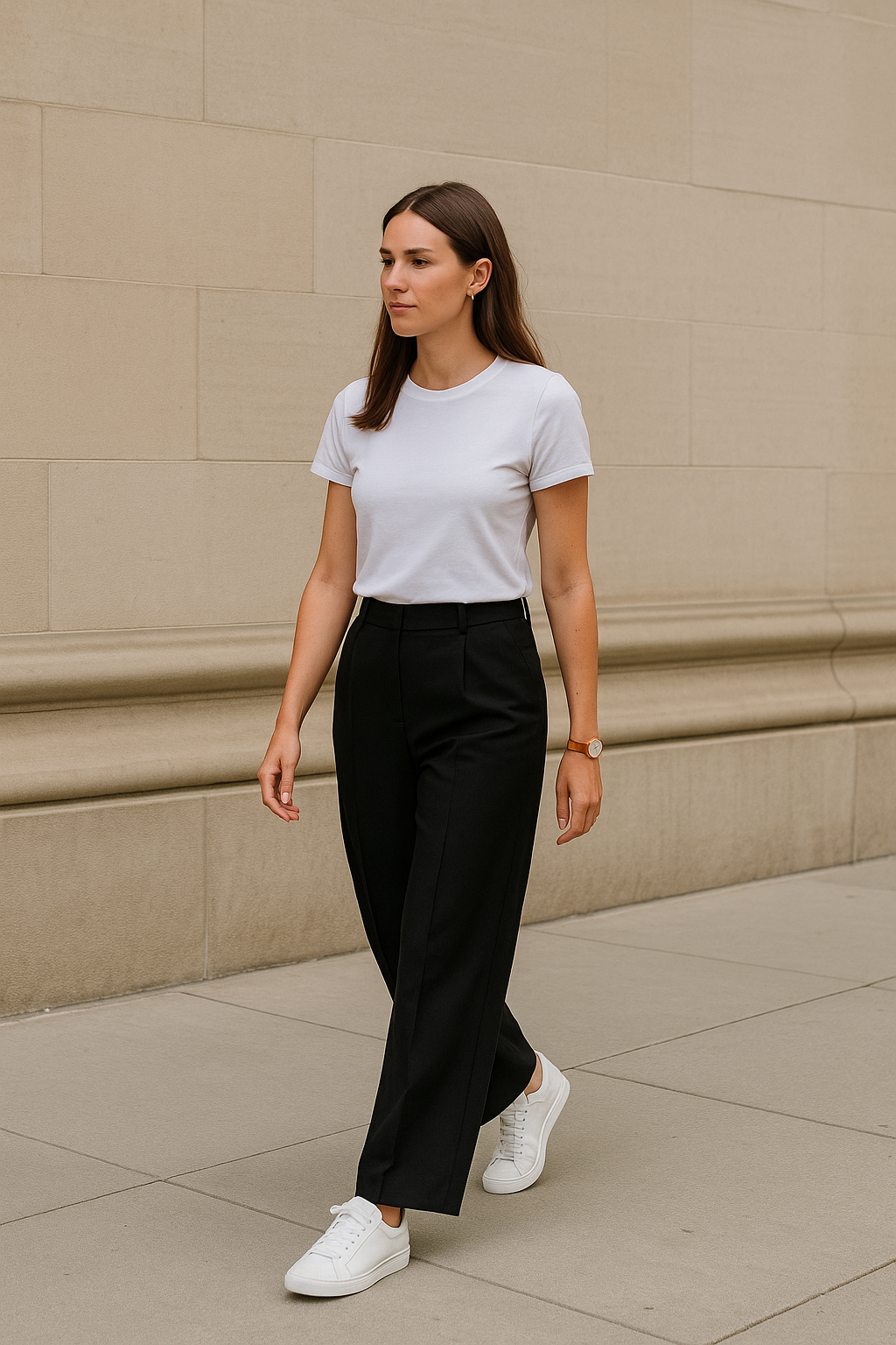 Sleek white sneakers are the perfect finishing touch, creating a streamlined look that works for errands, brunch, travel, or even casual office days. Add a crossbody bag or tote, and you’re ready to tackle your day in comfort and style without sacrificing sophistication.