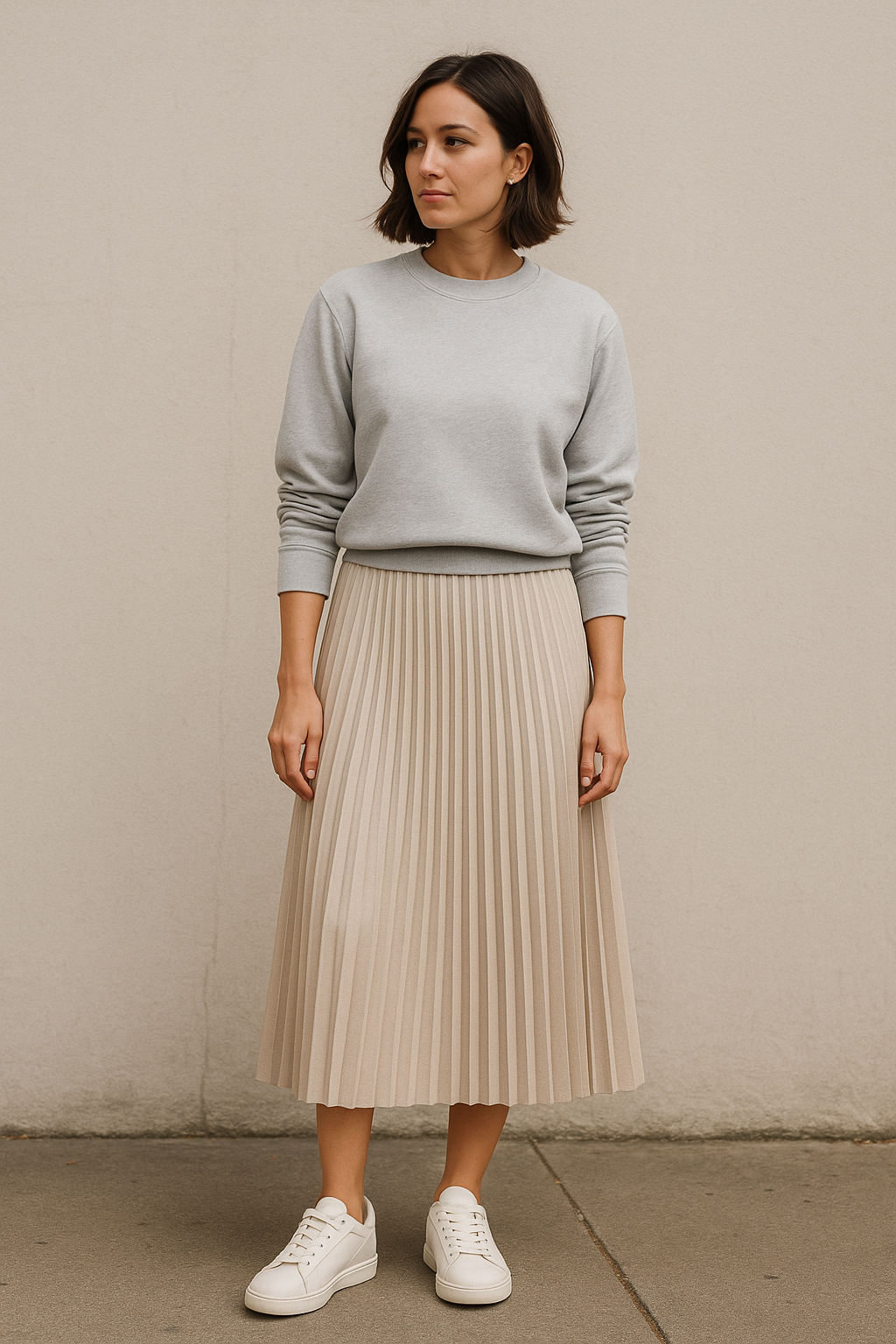 Pleated skirts bring instant polish to any outfit, with their structured folds adding movement and visual interest. Pairing one with a cozy crewneck sweatshirt creates a delightful contrast—refined meets relaxed.