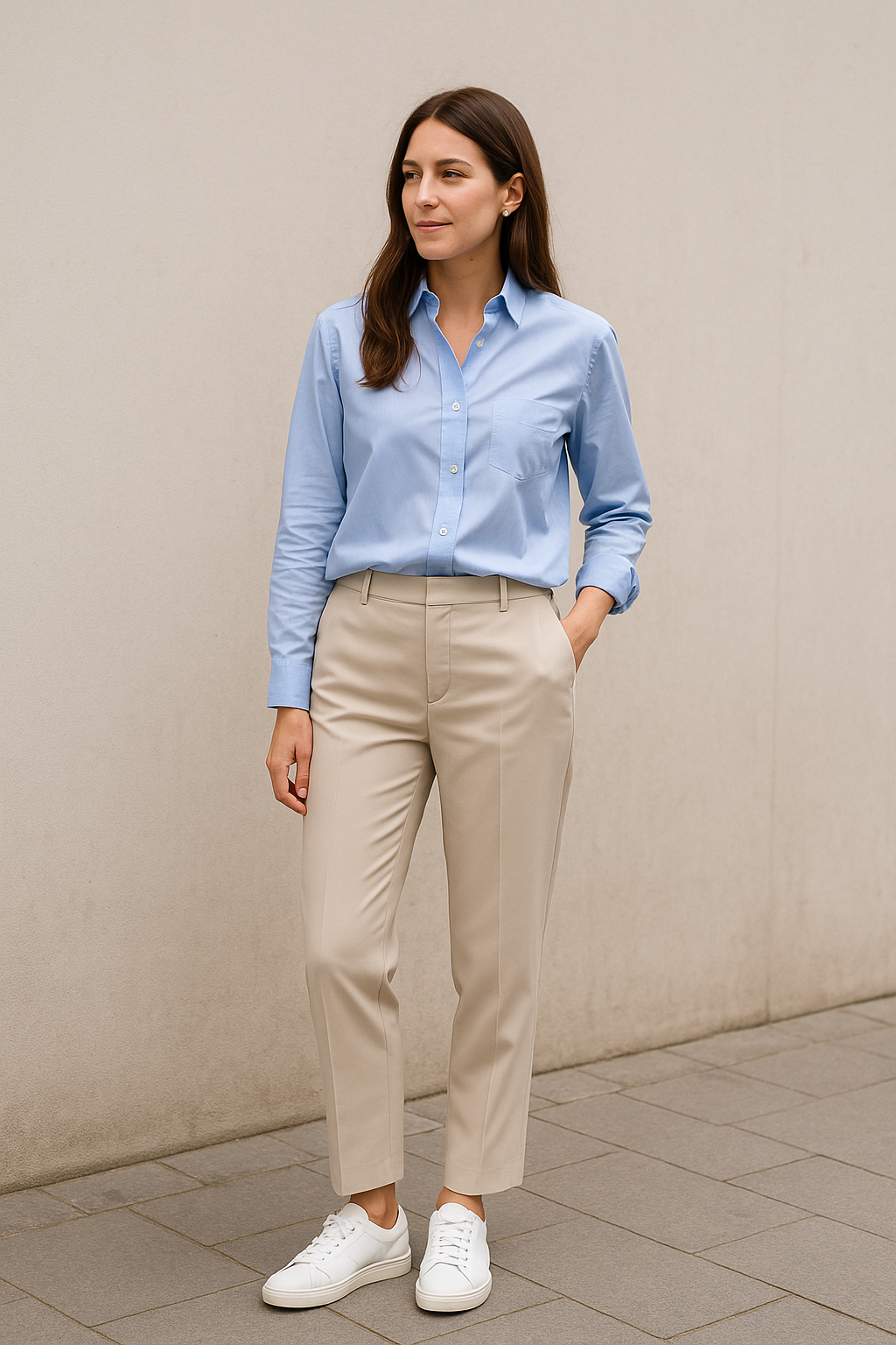 Tailored trousers have a magical way of making any outfit feel more intentional and grown-up. Pair them with a classic button-down—think soft blue, subtle stripes, or crisp white—and you’ve got a work-appropriate foundation. The half-tuck is key here, adding a touch of casual charm without looking sloppy.