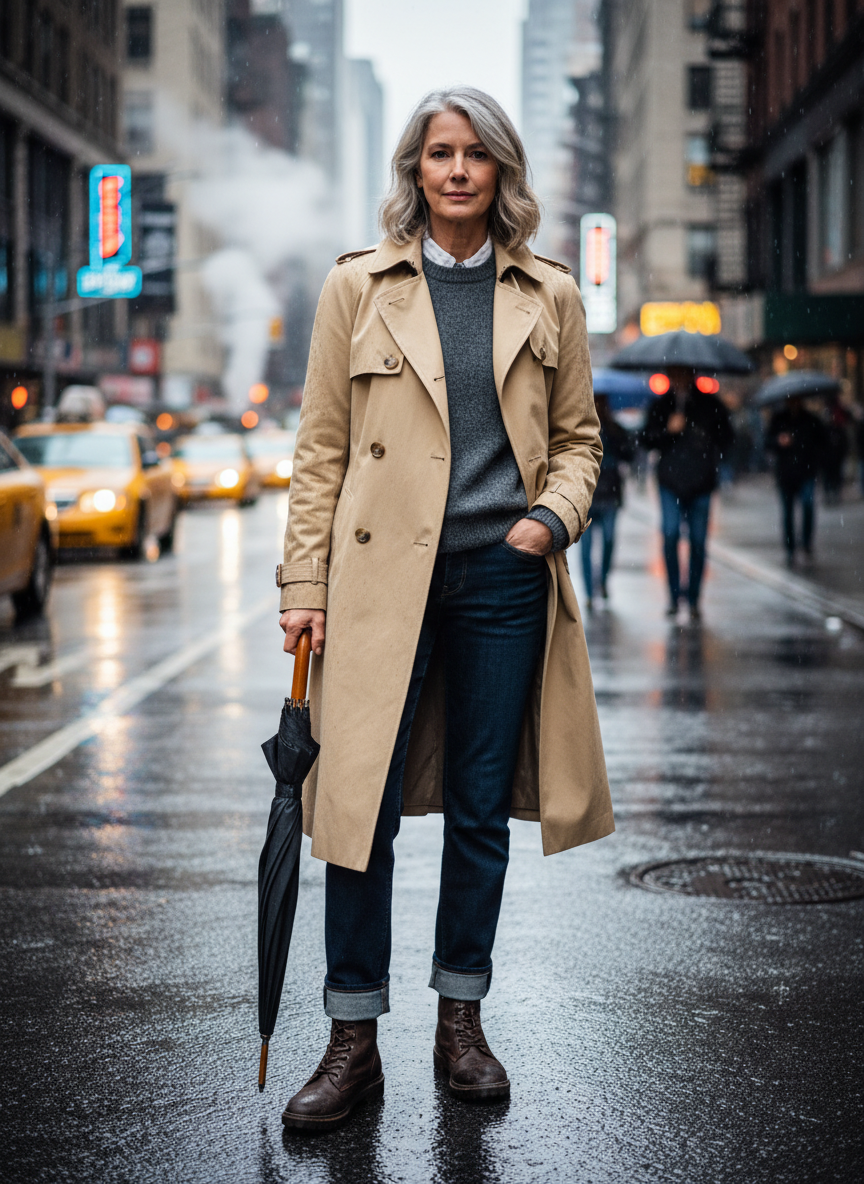 1. Classic Trench + Lightweight Cashmere Sweater + Dark Straight-Leg Jeans + Waterproof Leather Boots