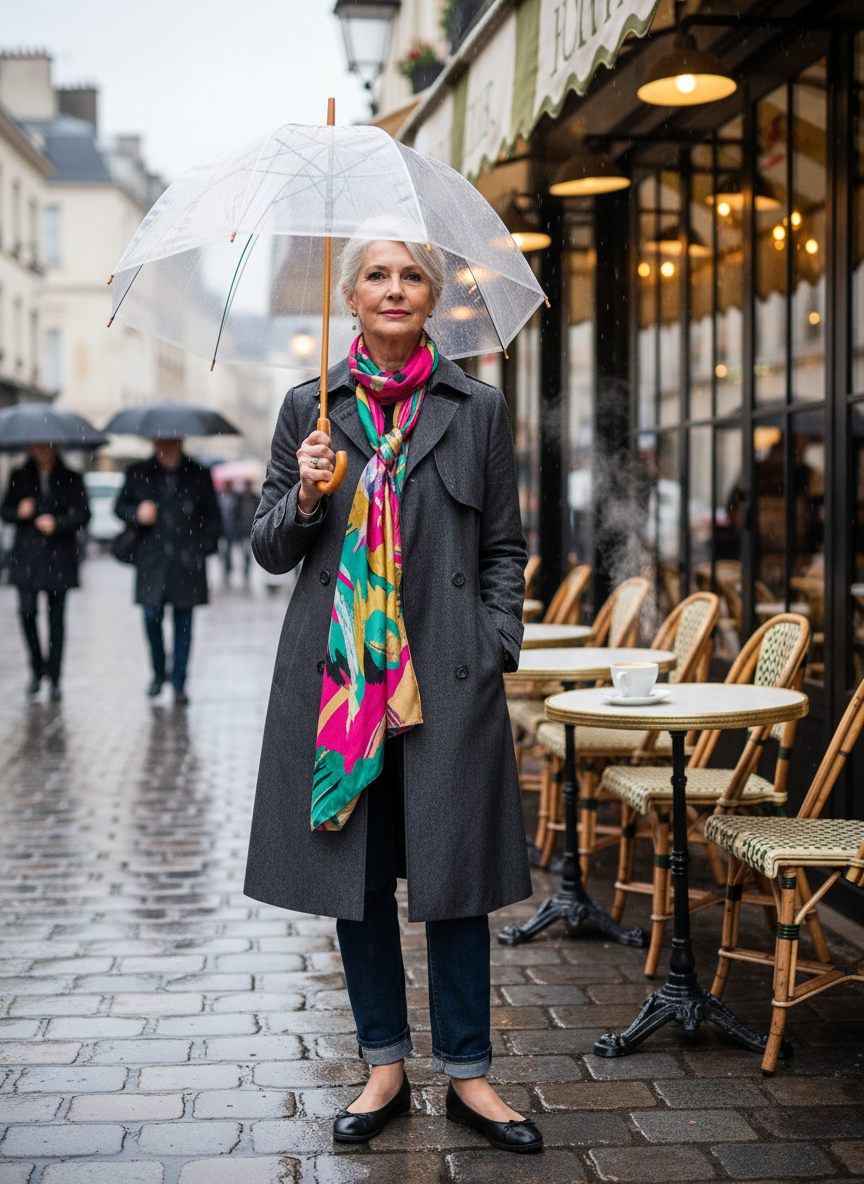 5. Textured Raincoat (matte finish) + Silk Scarf + Dark Denim + Ballet Flats with Waterproof Sole