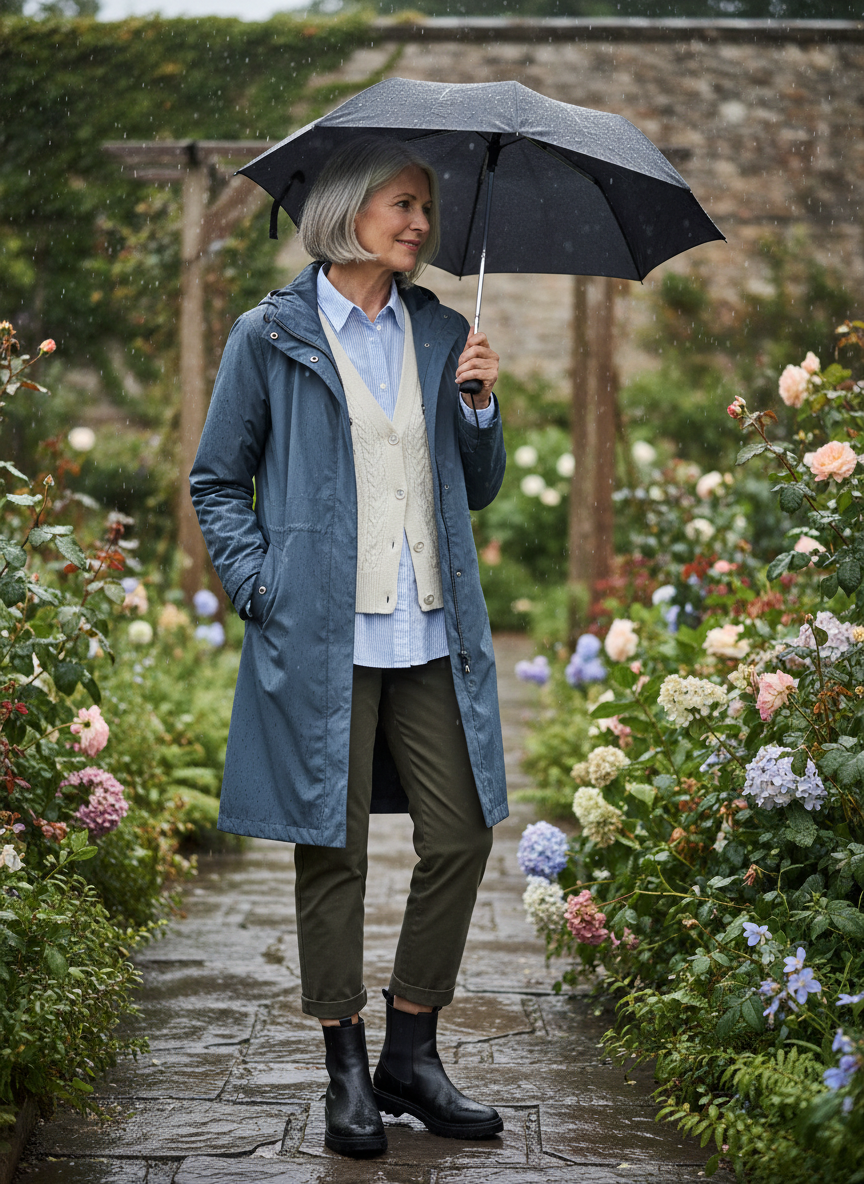 Layering a cardigan under your raincoat creates adjustable warmth perfect for fluctuating temperatures.
