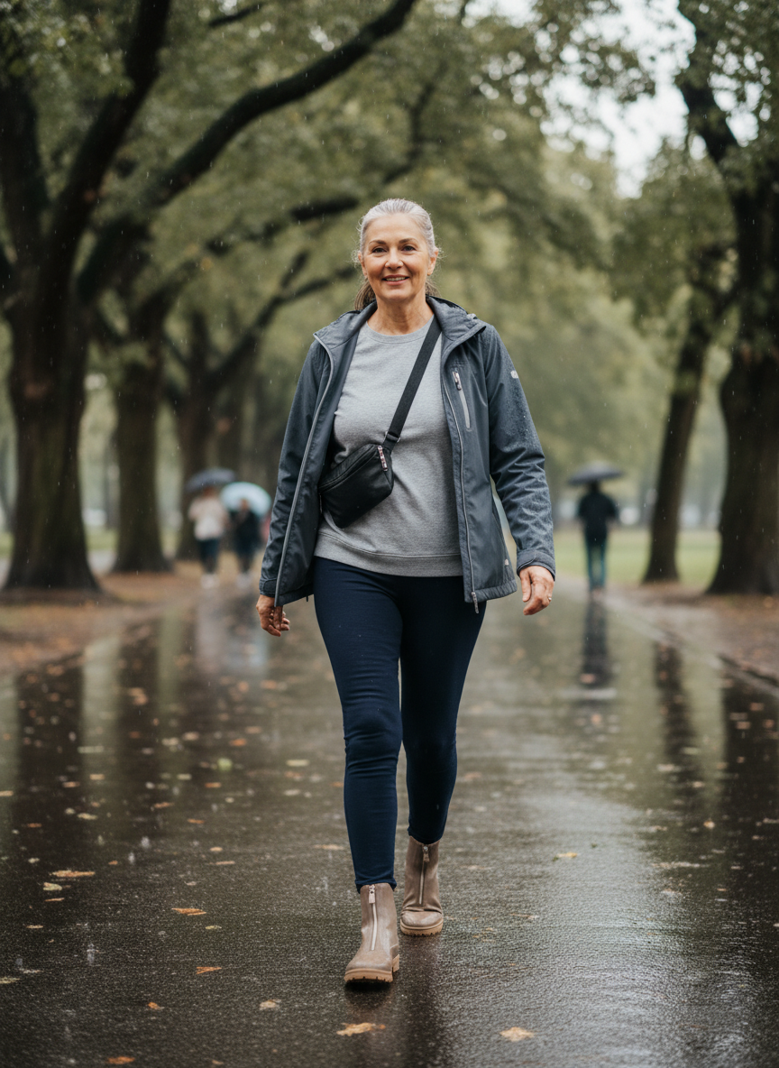 Stretch leggings paired with stylish waterproof ankle boots create an athleisure-inspired look that’s gained widespread acceptance.