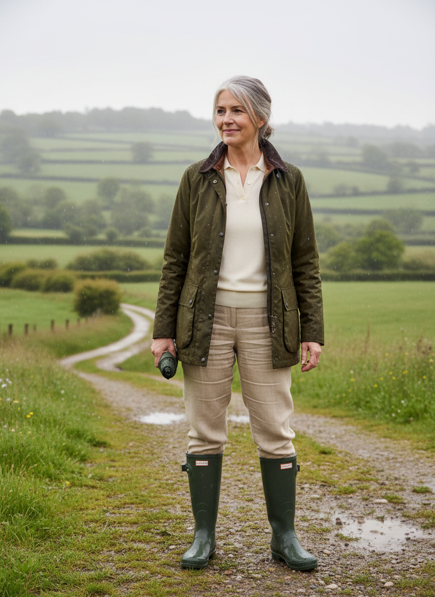 9. Structured Waxed Jacket + Fine Knit Polo + Straight-Leg Linen-Blend Pants + Classic Rain Boots