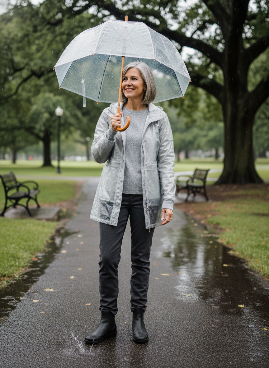 Pairing them with comfortable sneakers keeps the look modern and acknowledges that rainy days call for footwear with excellent grip and all-day comfort.