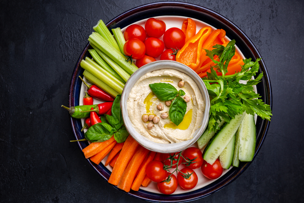 Store-bought hummus becomes the star of a healthy appetizer when surrounded by fresh, crunchy vegetables. Slice carrots, cucumbers, bell peppers, and celery into sticks for easy dipping.