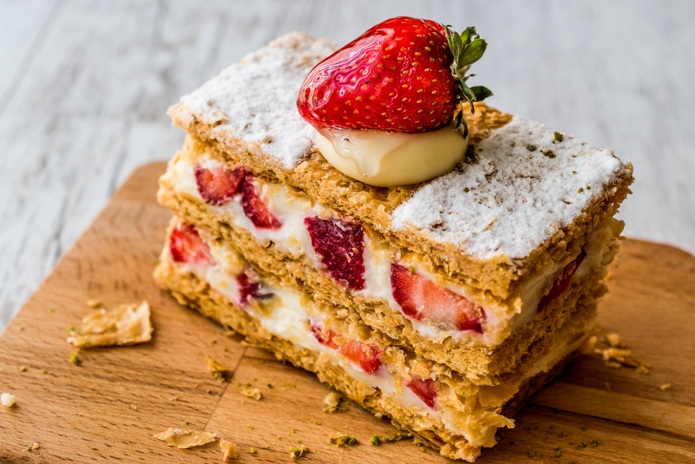 The name means a thousand leaves in French, referring to the many flaky layers in puff pastry. Stack three layers of baked pastry with pastry cream and fresh strawberries between each one. The combination of crispy pastry and smooth cream creates an incredible texture experience.