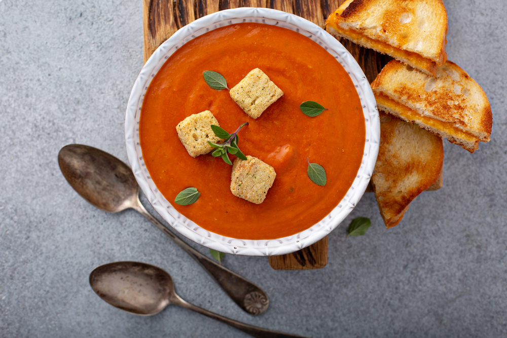 1. Creamy Tomato Basil Soup with Grilled Cheese Croutons