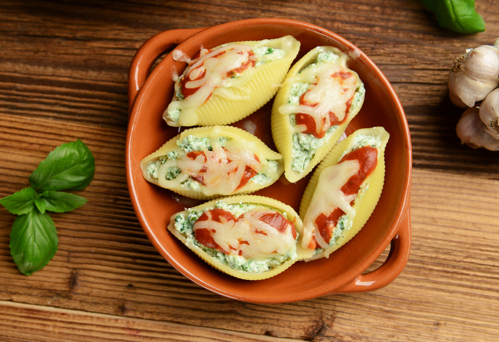 Boil jumbo shells until just tender. Mix ricotta, cream cheese, chopped spinach, artichoke hearts, garlic, and mozzarella. Stuff each shell generously, arrange in a baking dish with marinara sauce, and top with more cheese.