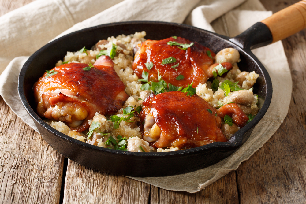 Season the chicken and sear it skin-side down until golden. Flip and pour over a mixture of honey, soy sauce, minced garlic, and a splash of rice vinegar. Let everything bubble and reduce into a glossy glaze that clings to every inch.