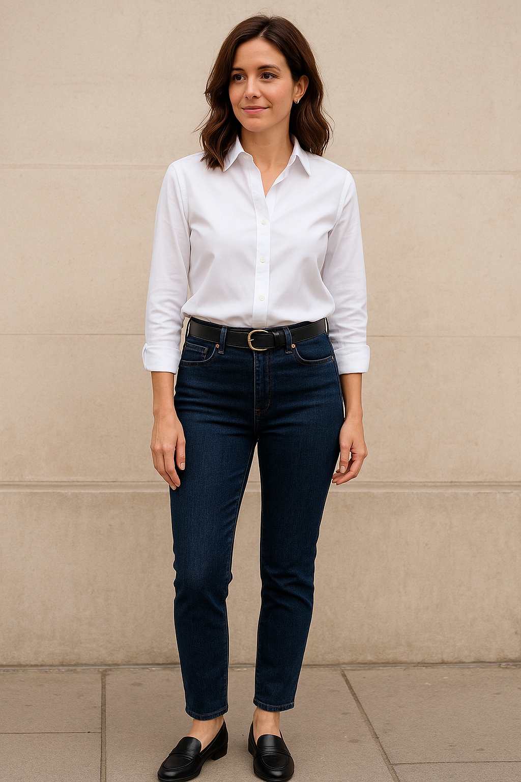1. Crisp White Button-Down & Classic Blue Cigarette Jeans