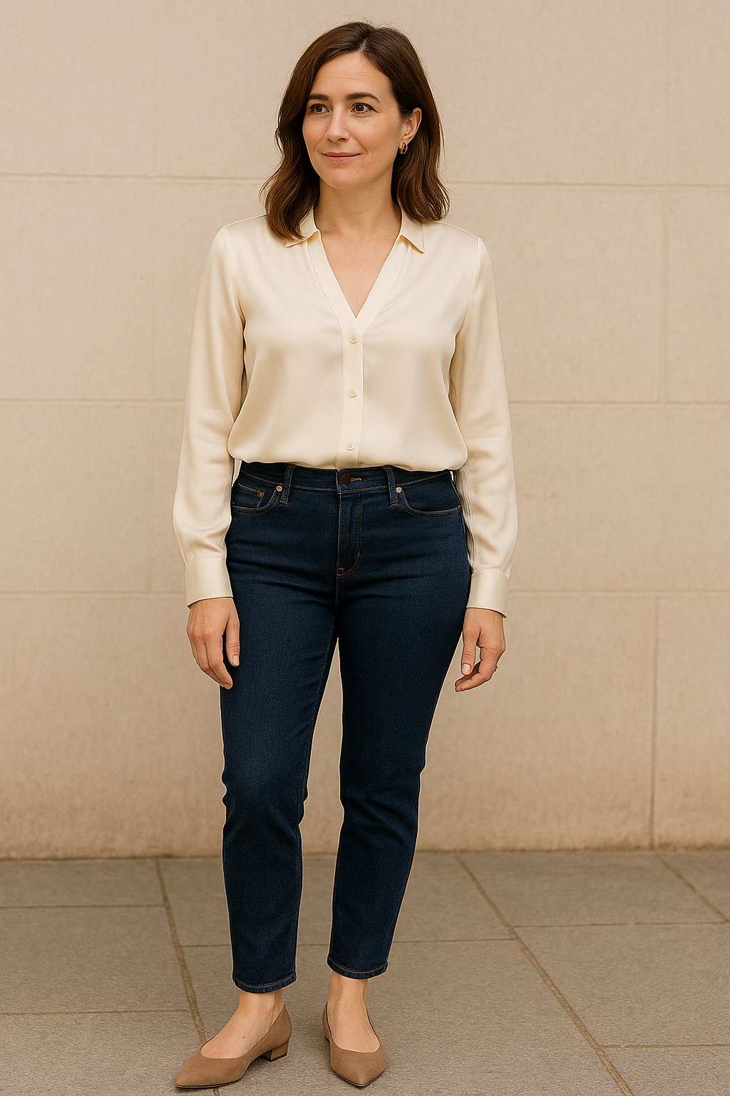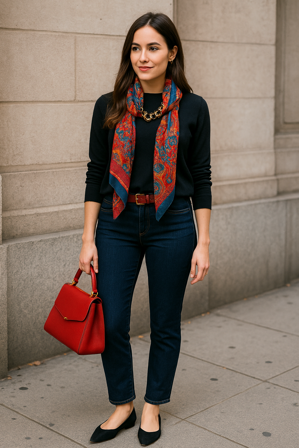 The contrast between the structured denim and the flowing blouse creates visual interest. Plus, the pointed toe of your shoes helps elongate your legs, making this combination universally flattering and age-appropriate.