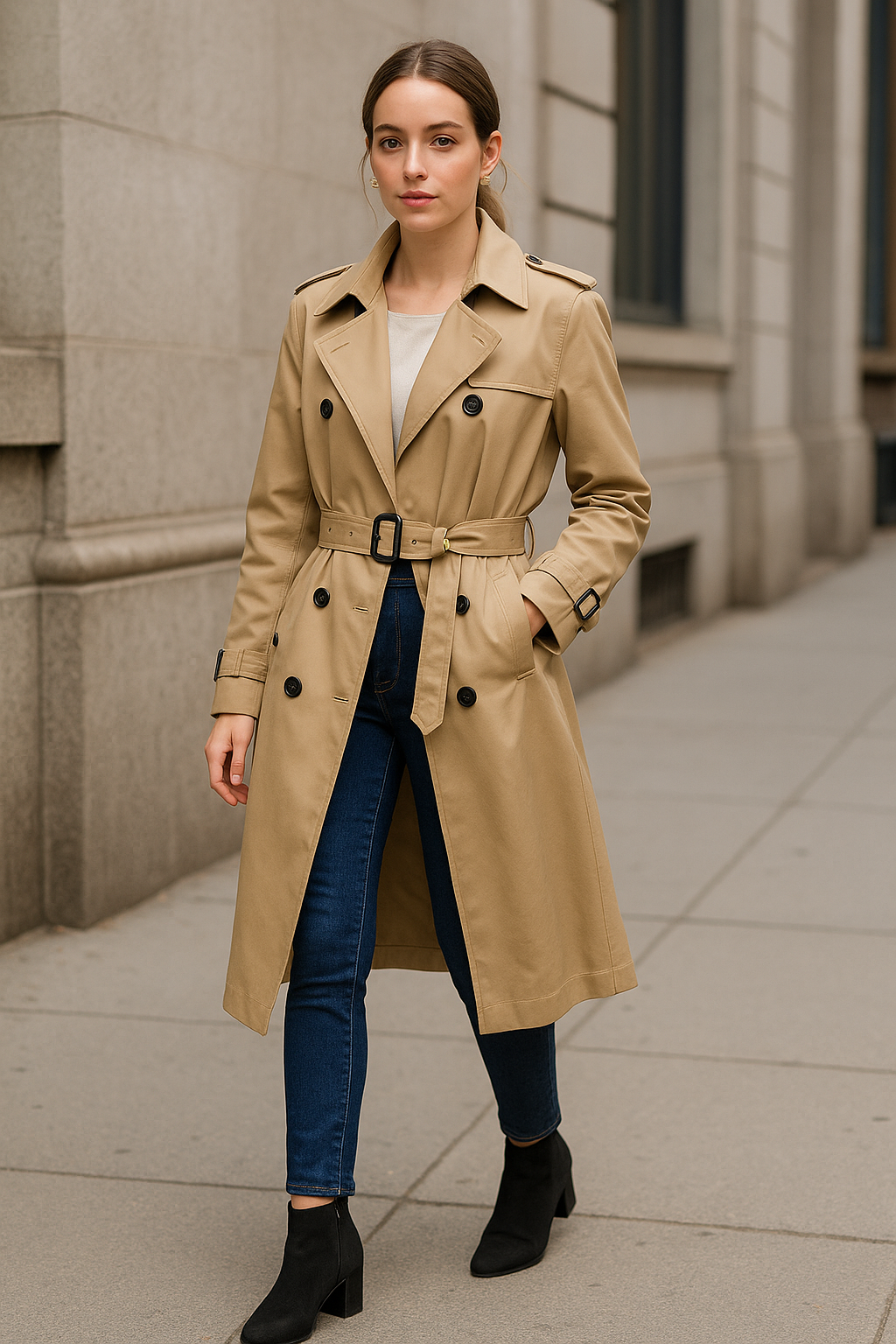 High-rise cigarette jeans are a game-changer for creating the illusion of longer legs. When you pair them with a belted trench coat, you get instant polish and sophistication. The belt cinches at your natural waist, emphasizing your silhouette beautifully.