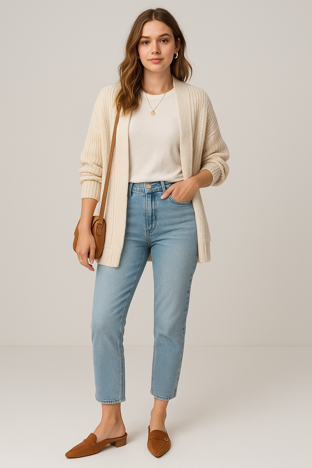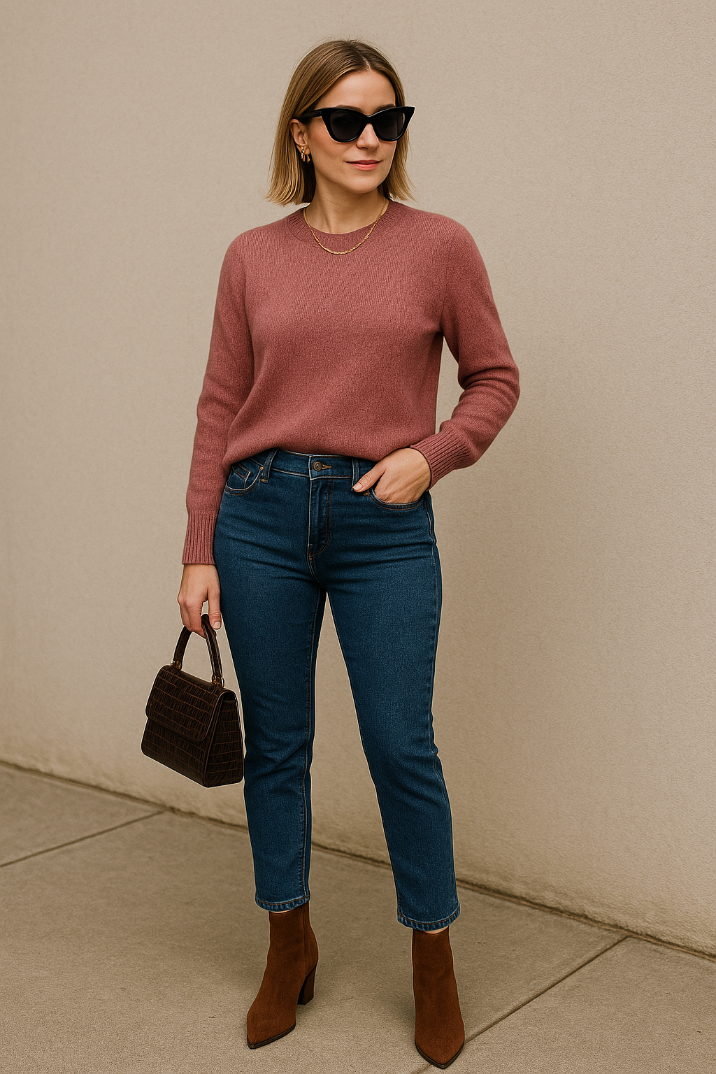 Cozy meets chic when you pair a soft knit sweater with mid-rise cigarette jeans. Choose a sweater in a colour that complements your skin tone—think dusty rose, sage green, or warm mustard.
