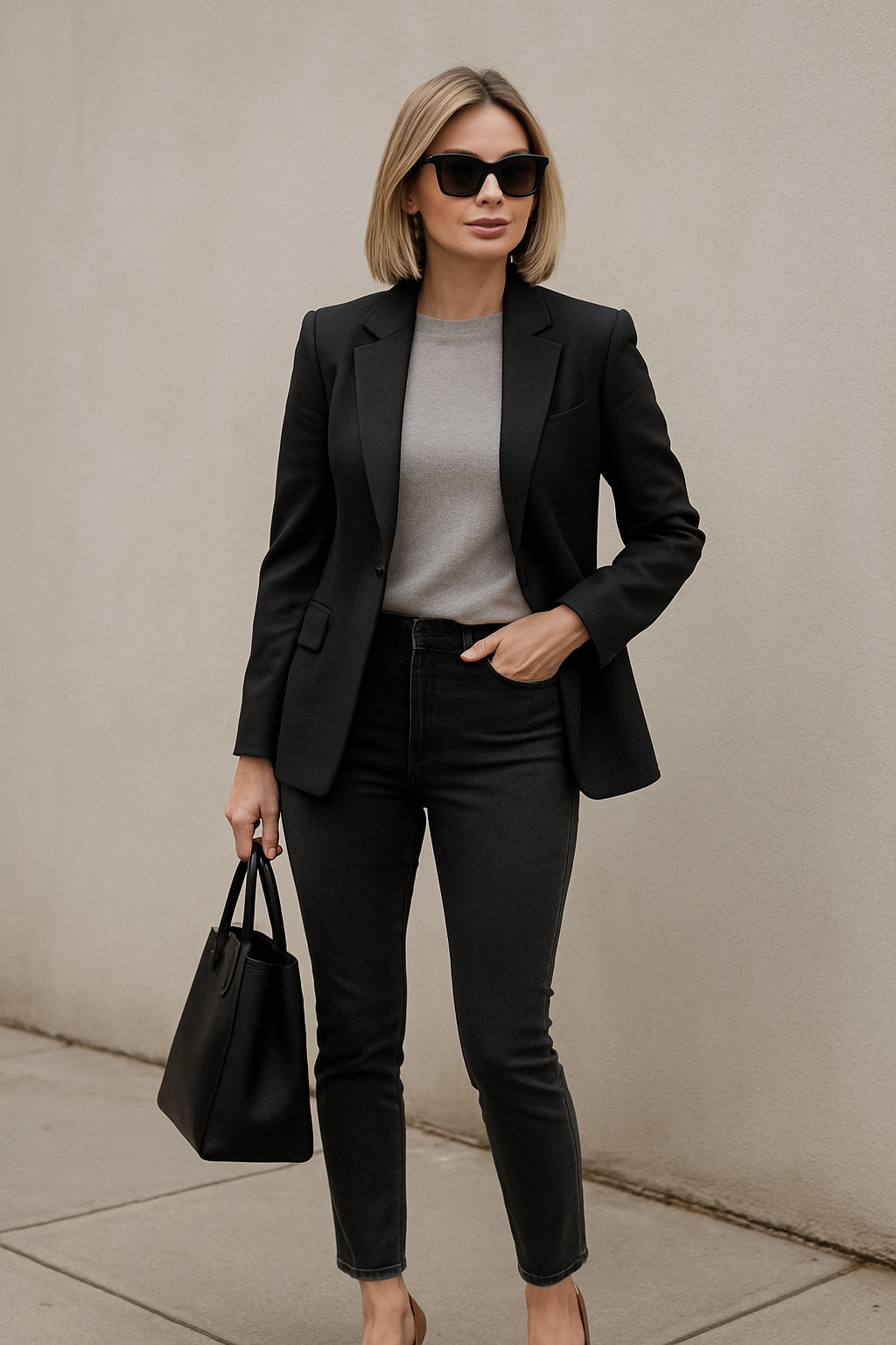 Monochrome dressing creates a sophisticated, elongated look that flatters everyone. Pairing cigarette jeans with a neutral-toned top in grey, camel, or black instantly feels polished and put-together. Adding a tailored blazer takes the outfit to another level of refinement.