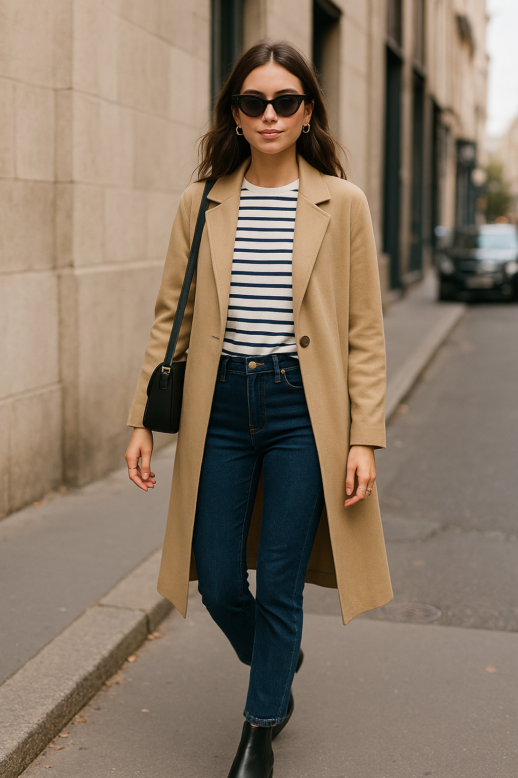 Channel your inner style icon with a classic striped Breton top and cigarette jeans. This French-inspired combination has been beloved for decades because it simply works. Adding a lightweight midi coat transforms the outfit into something special for transitional weather.