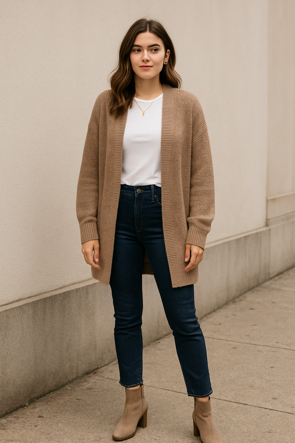 The oversized cardigan adds dimension and texture without overwhelming your frame. Choose one in a soft knit for maximum comfort and visual appeal.