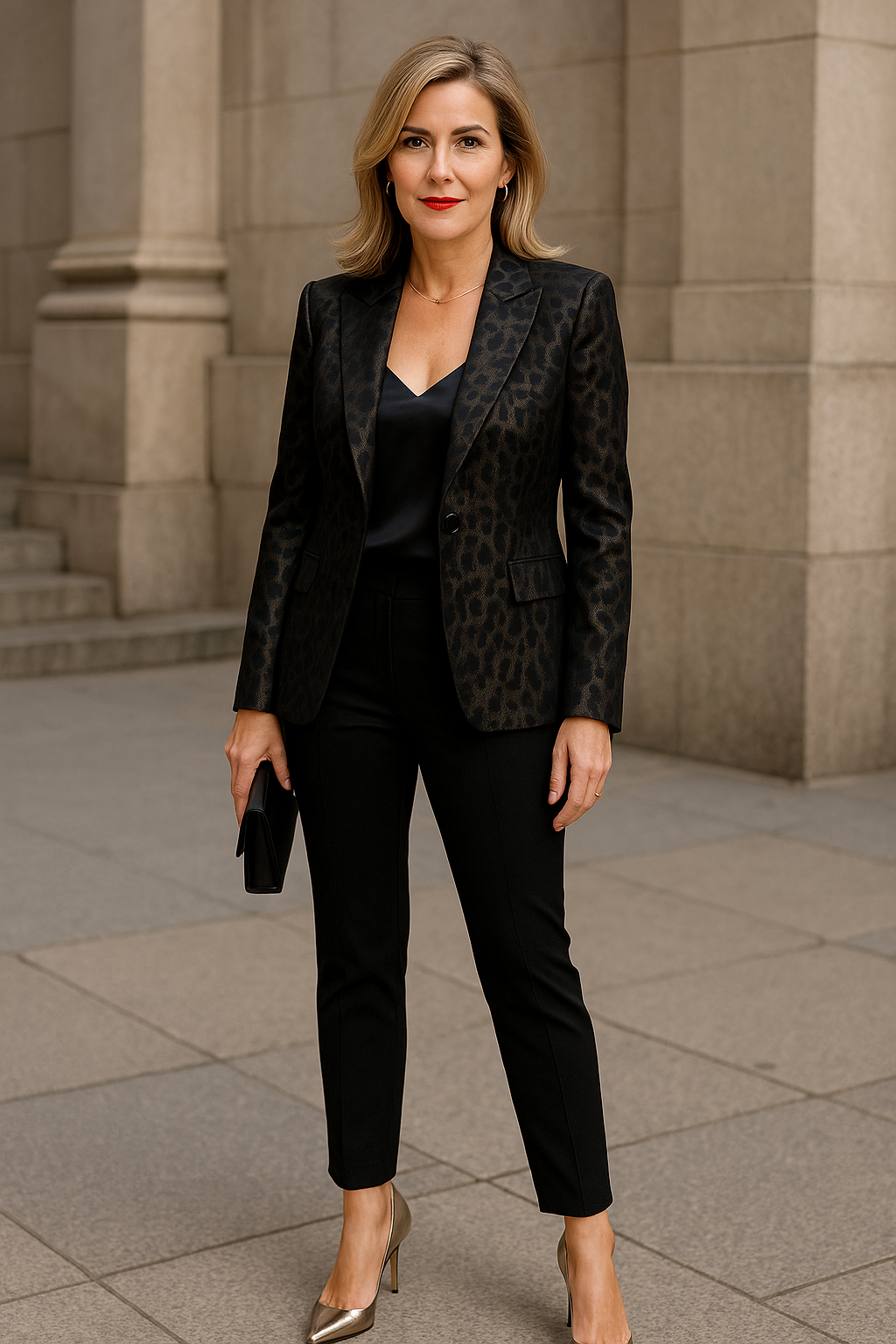 Layer a satin cami underneath a statement blazer for a mix of textures that catches the light beautifully. Metallic heels and bold lipstick add just the right amount of drama and confidence.
