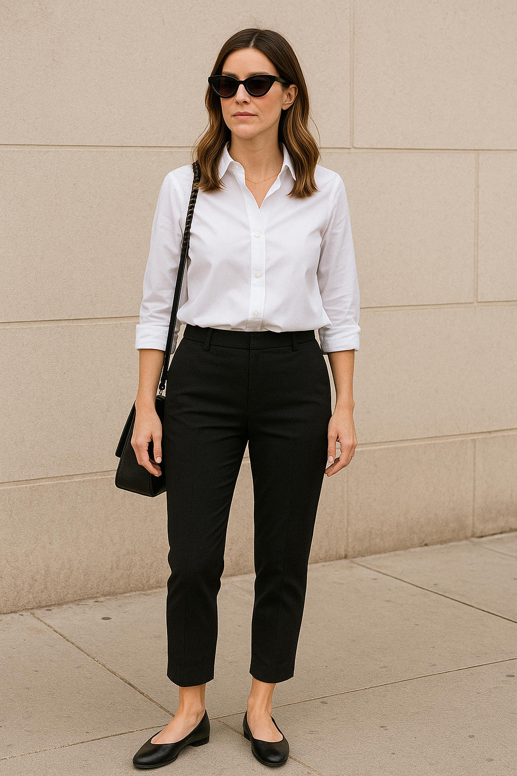Style them with ballet flats or sleek loafers and a structured tote for a polished everyday look. The clean lines keep everything minimal and sophisticated, making this outfit perfect for running errands, casual meetings, or coffee dates.