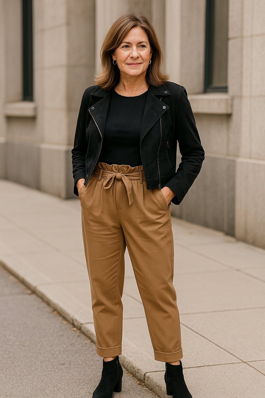 Balancing structured pieces with casual comfort creates an outfit that’s smart yet approachable, ideal for weekend brunches or casual Fridays at work. This ensemble shows you can look effortlessly stylish without trying too hard.