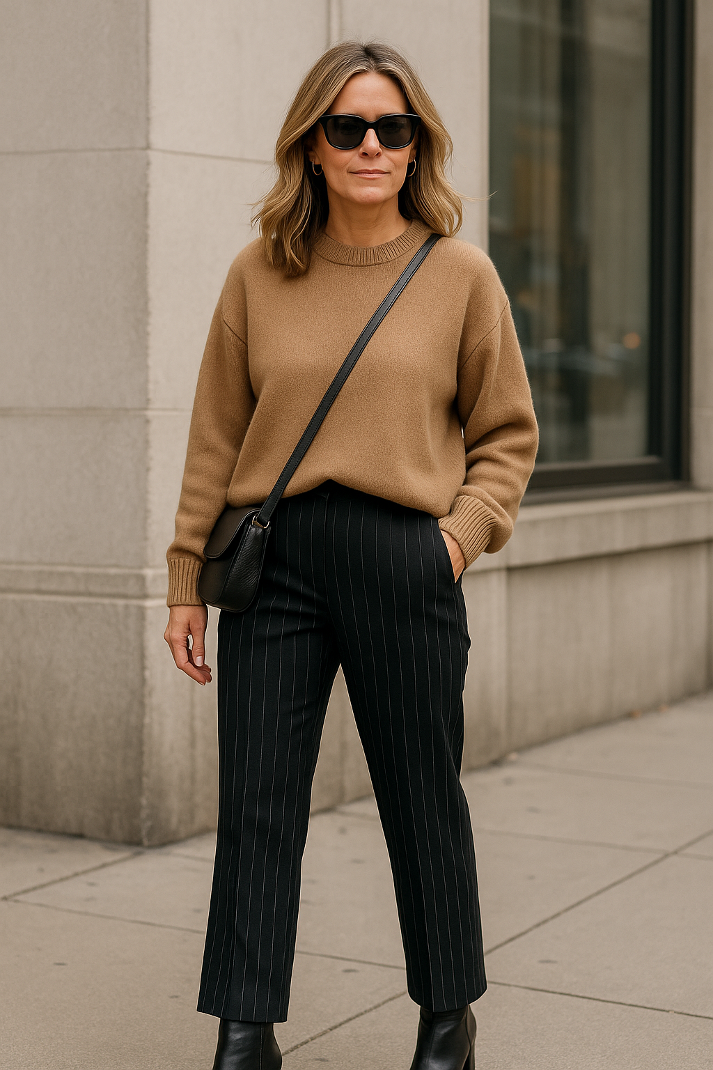 Fashion-forward yet totally wearable, this outfit strikes the perfect balance between trendy and timeless. Pinstripe trousers bring a classic menswear-inspired vibe, while an oversized sweater adds cozy comfort and modern flair.