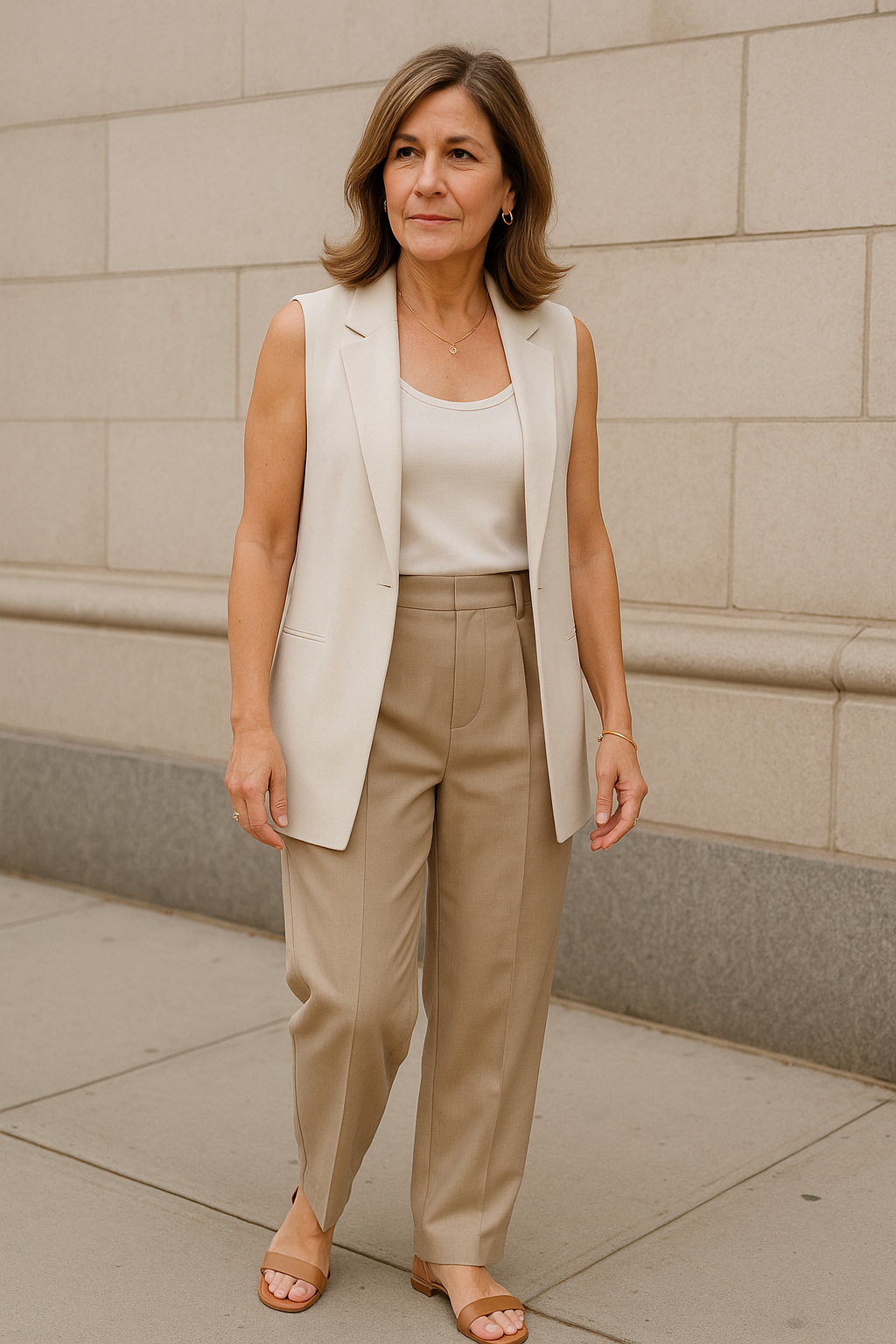 A longline vest elongates your figure and creates a sleek vertical line that’s ultra flattering. Delicate gold jewelry and strappy sandals add feminine touches without overwhelming the structured pieces.