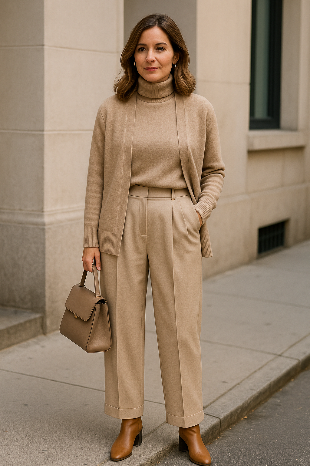 Soft neutrals in matching tones feel intentional and expensive, creating a cohesive look that oozes sophistication. Pleated trousers add texture and movement, while a fine-knit turtleneck paired with a matching cardigan keeps everything coordinated.