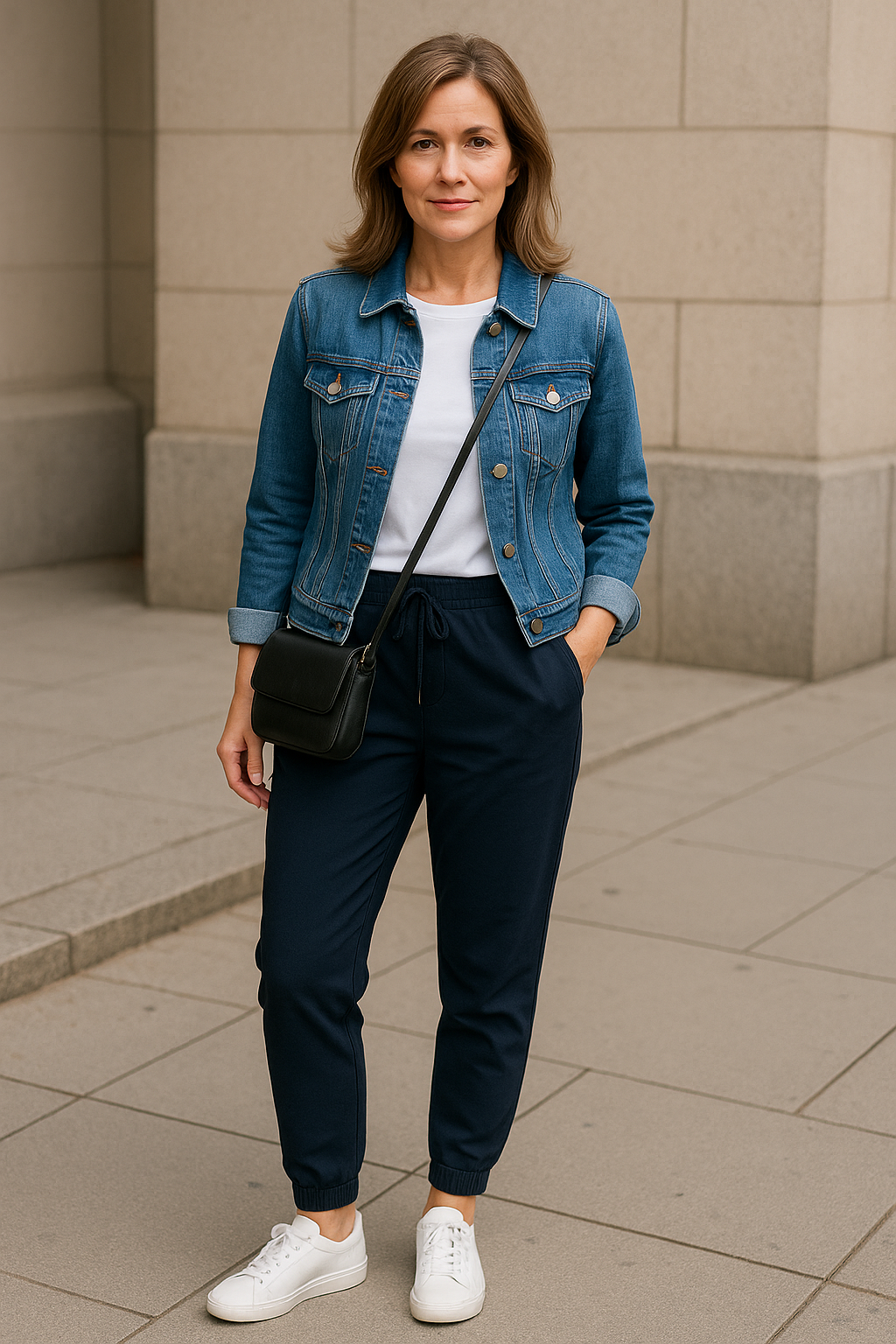 Layer a fitted tee under a classic denim jacket for a casual vibe that still looks intentional. White sneakers and a crossbody bag complete the look with practicality and style.
