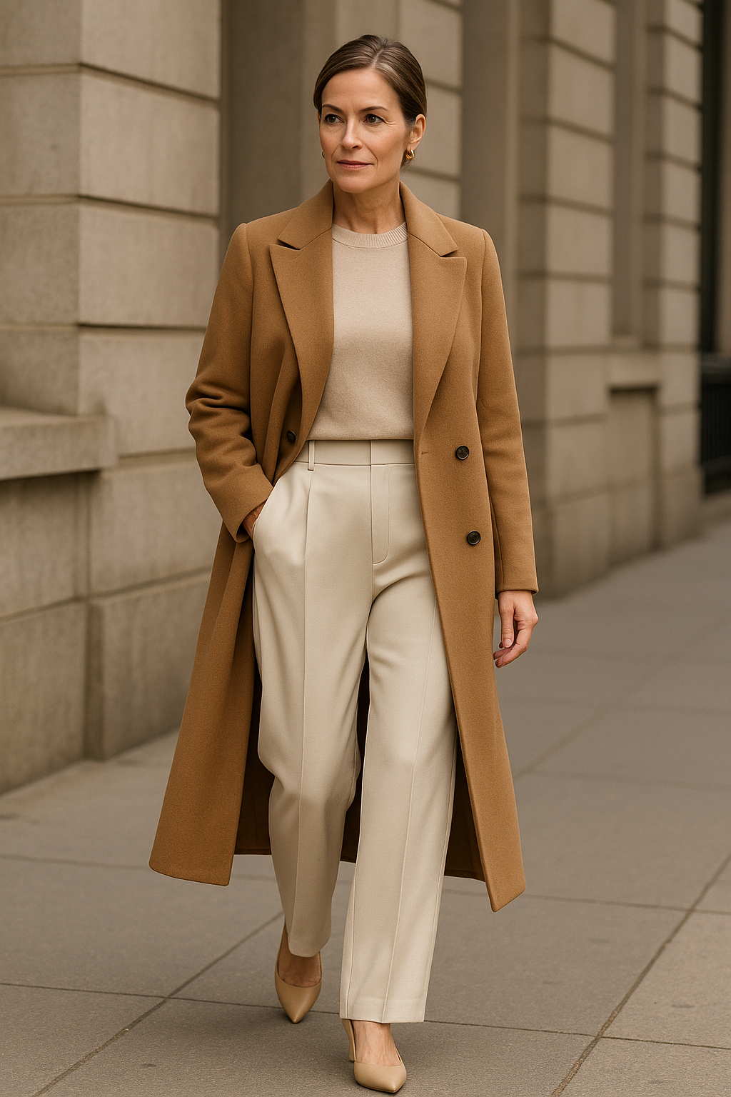 Old-money vibes without the old-school stiffness—this outfit exudes timeless sophistication and quiet luxury. Wide-leg cream trousers flow beautifully, while a camel coat adds warmth and elegance in equal measure.