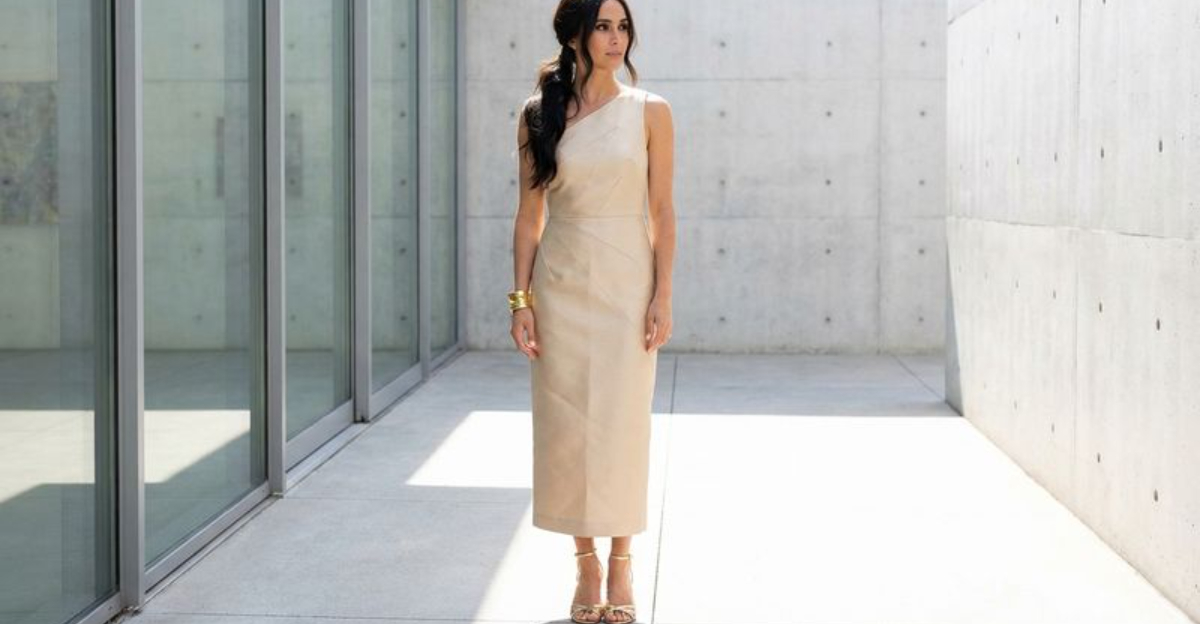 A one-shoulder column dress with clean, minimal lines makes a statement through its silhouette rather than excessive decoration.