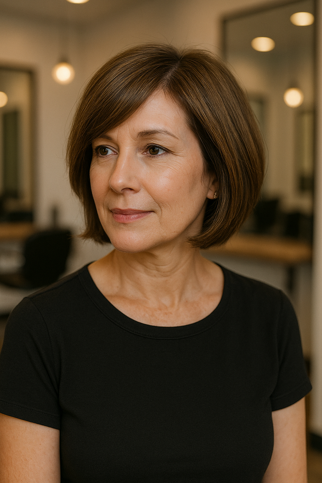 The chin-length cut provides structure and polish, while the bangs sweep across your forehead to minimize worry lines and create a more youthful appearance. This style works wonderfully for women with square or round face shapes, as it adds length and angles.