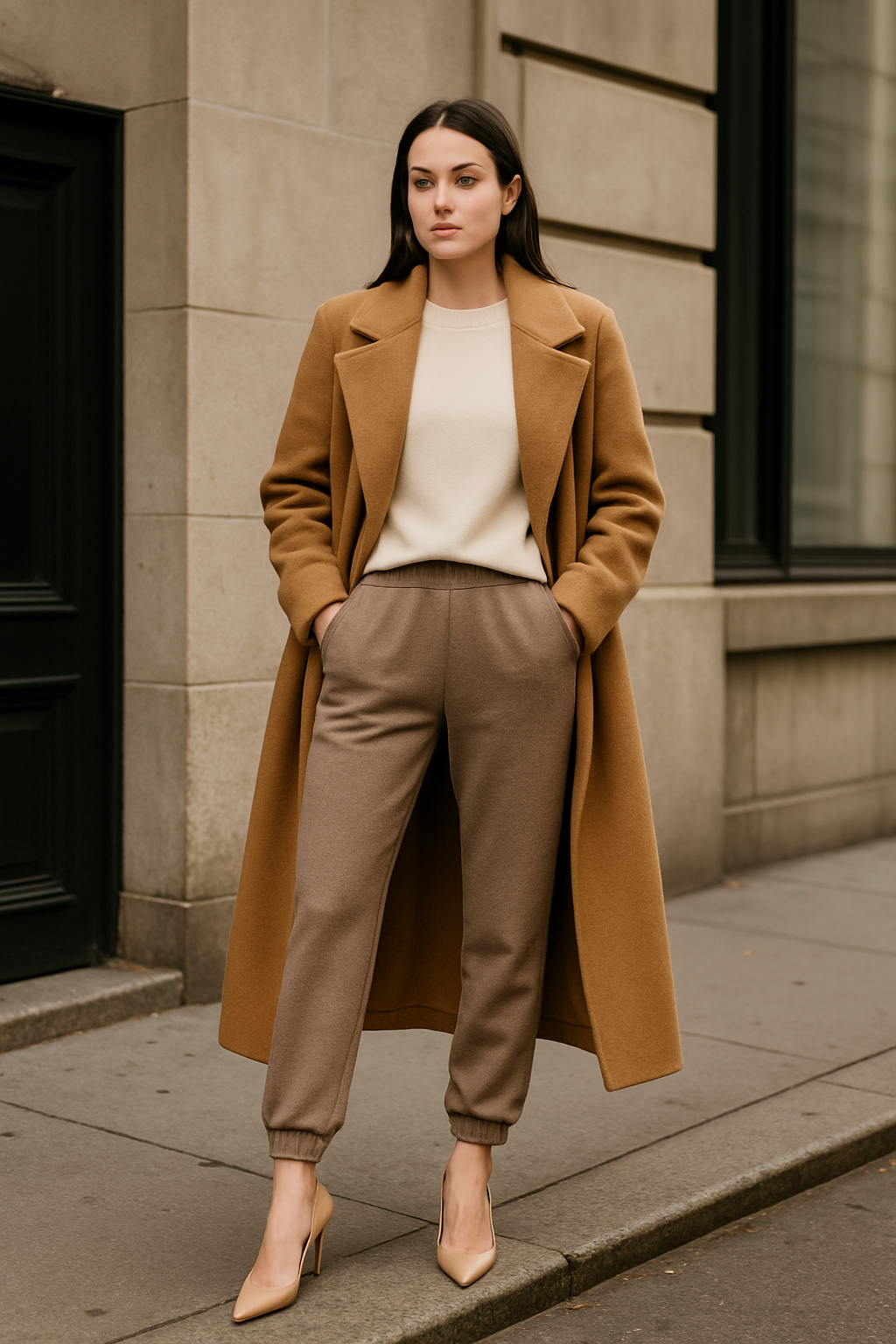 A long wool coat, trench, or faux fur instantly glamorizes the entire outfit. It’s an easy trick that makes sweats look runway-ready.