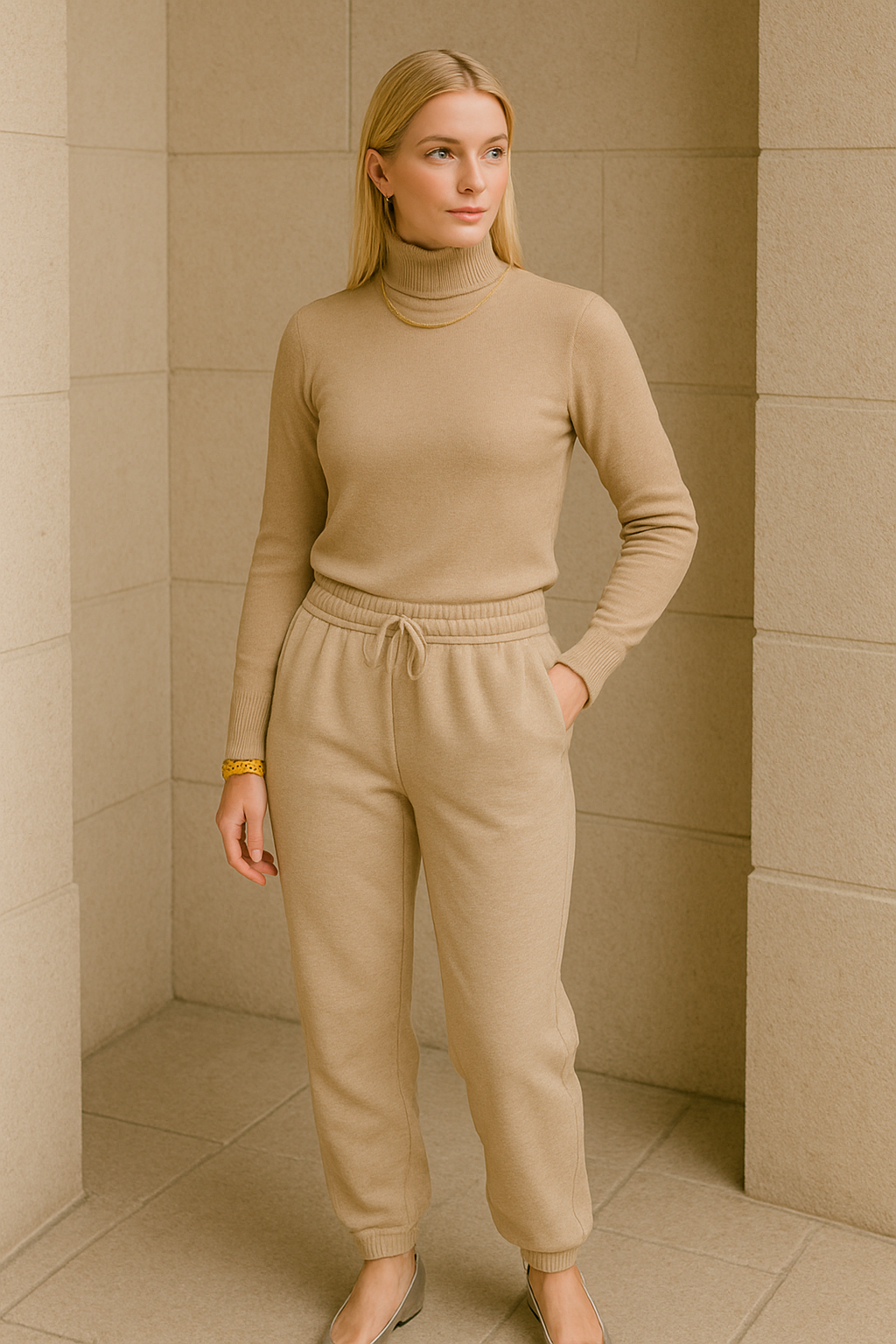 Even the coziest joggers look elevated when paired with a sleek bun, glowy makeup, or a bold lip.