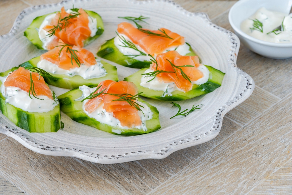 Cucumber provides hydration and crunch without adding many calories, making it the perfect base for rich fish. A tiny dollop of cream cheese or Greek yogurt between the cucumber and salmon adds creaminess and helps everything stick together.