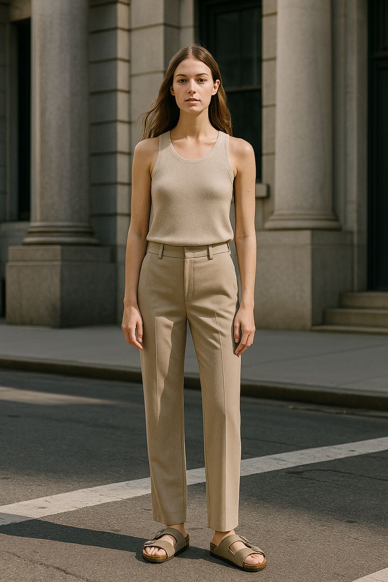 Straight-leg trousers paired with a lightweight knit tank and classic Birkenstock Arizonas create the foundation of effortless 2026 dressing.