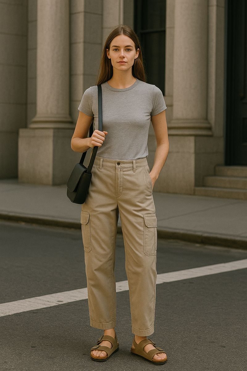 Soft cargo pants get a sophisticated upgrade when paired with a fitted tee or ribbed tank and Birkenstock Milanos.